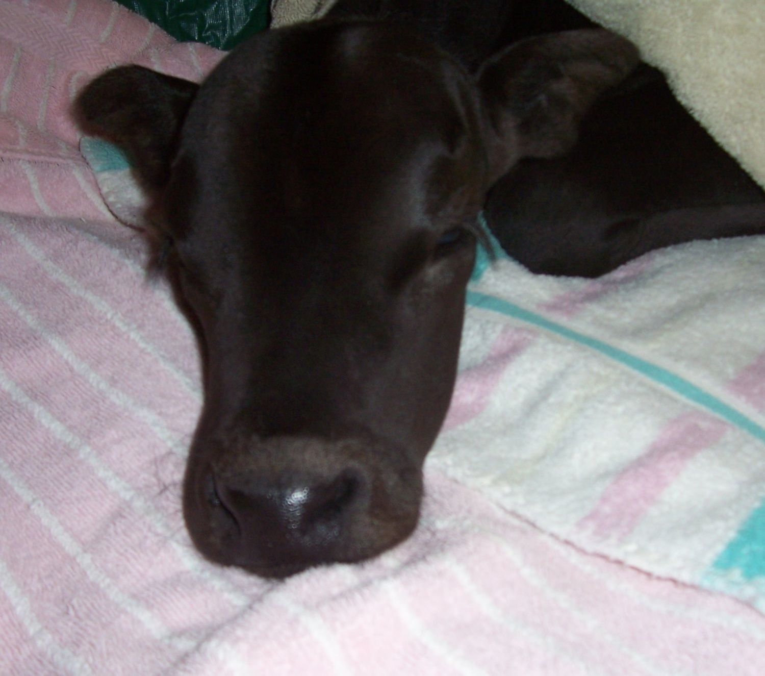 My morning got busy when the boys brought in a newborn calf...obviously premature! Estimating she is about 5 - 6 weeks premature and unable to stand, but very alert. Her coat is like short velvet and was dry including the umbilical cord so we think she may have been born yesterday. Little at 20 pounds, Velvet is aggressive suckling on a bottle, headbutting the bottle and bawls with gusto....that is half the battle for survival. With help she trys to stand using her back legs for balance.