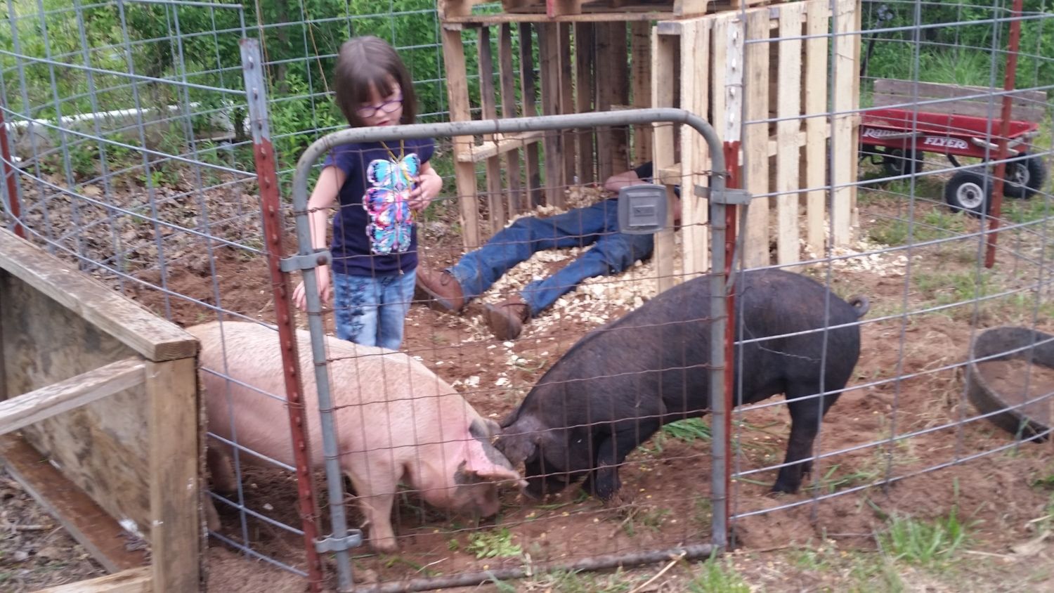 Got our first pigs today. Hope the kids remember at least one of them will be yummy. Long legs is working on the shelter by himself.