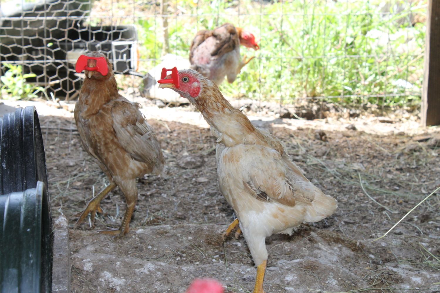 Here is a picture showing the blinders and another showing how bad they were pecking at the rooster. I just put the blinders on them the other day. I hope it makes the pecking stop.