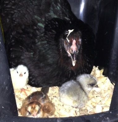 So 4 out of 11 eggs have hatched. I put some eggs under her the day after the others. So tomorrow will be day 20 for about half of them. This is so much more fun than using an incubator! And there is nothing I have to do to take care of the chicks. Mama Onyx seems very capable.