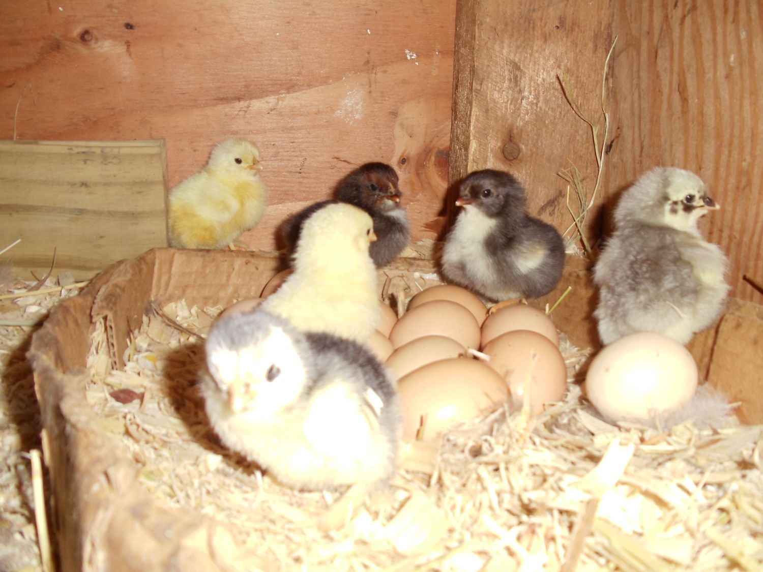So here is my final head count! Got six beautiful chicks from my first ever hatch! Had some minor faults, and will learn from those for next time! Yes there will be a next time! Had a lovely broody hen, and ended up with two when my Bantam Cochin decided she wanted to help. Now they are taking turns eating and leaving the coop to forage, while one is always with the babies. Too cute! Any one care to guess on my breeds? I wasn't able to save the broken egg c hick on Saturday but I was able to help another that broke and shrick wrapped under mom. I did wait two days, and by the time I chose to help out the poor little one was in cement but screaming away. Used a moist wash cloth and kept it warm and within the half hour the little buddy was busting out! Later I smuggled it back under mom! Now, my question is that my coop is 3 feet off the ground. I put shelved 2x4s in there to kind of gate them in, in case they decide to try to fall out. However, they will eventually try to follow mom right? Should i start moving them to a ground level crate? Or will they know how to climb up and down the ramp? I don't want them to fall and get hurt.