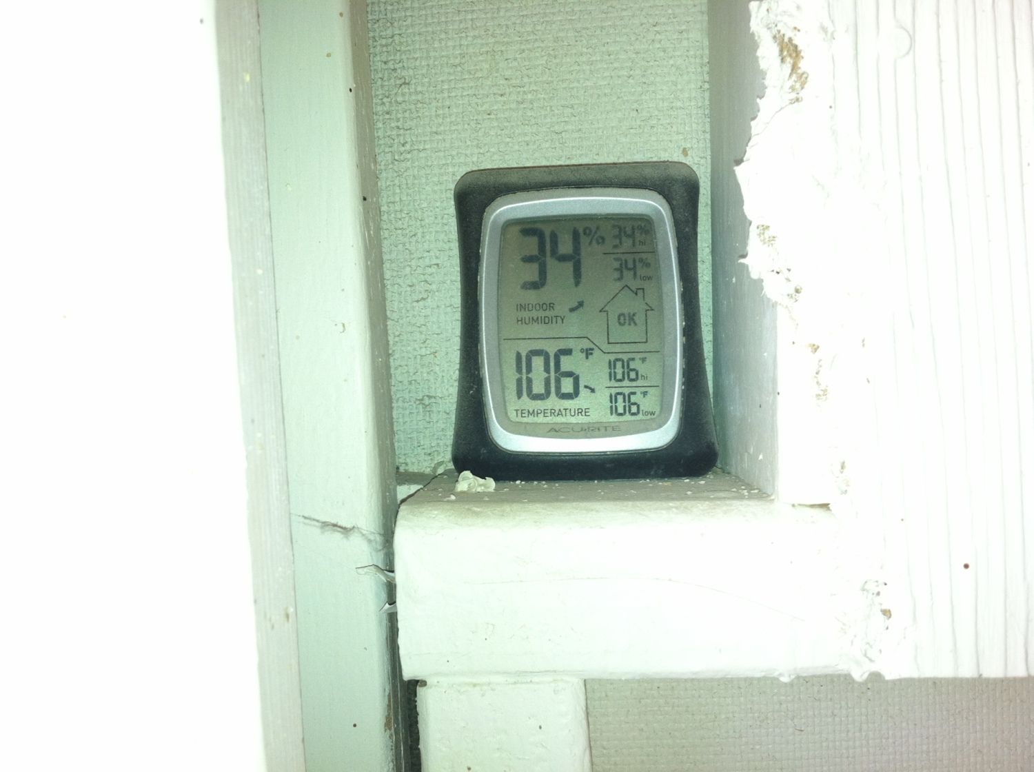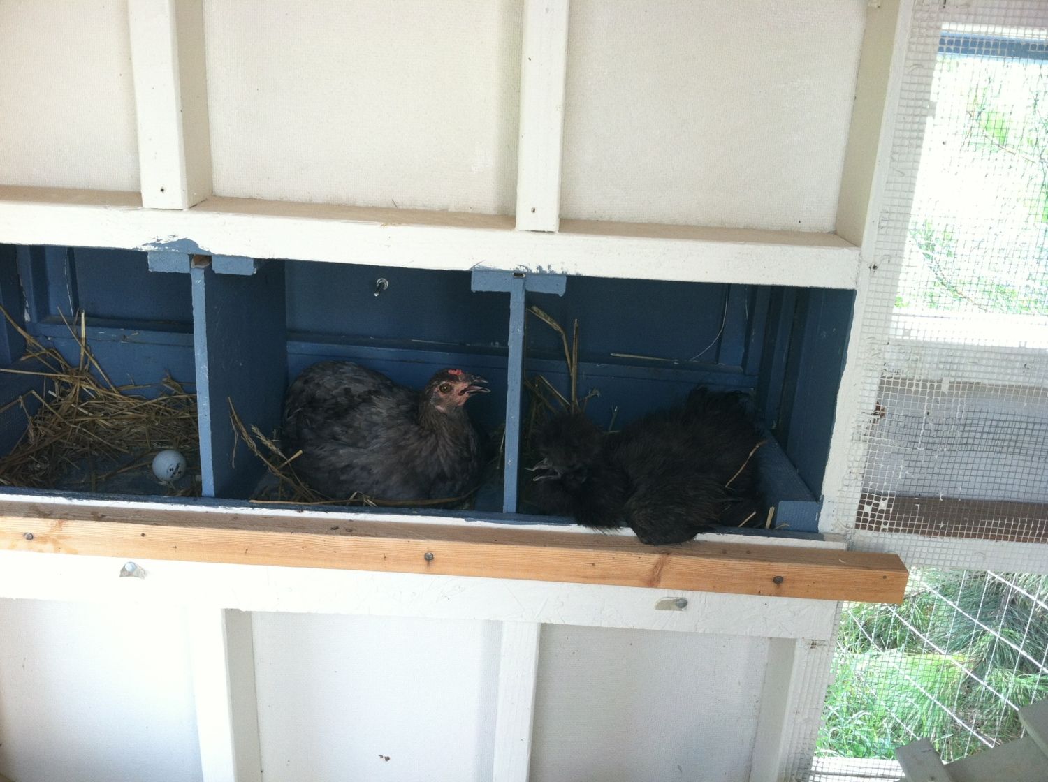 Inside the coop temps are 106F and those two foolish chicks are still sitting in the nest boxes - I keep taking them out and they keep getting back up in them.