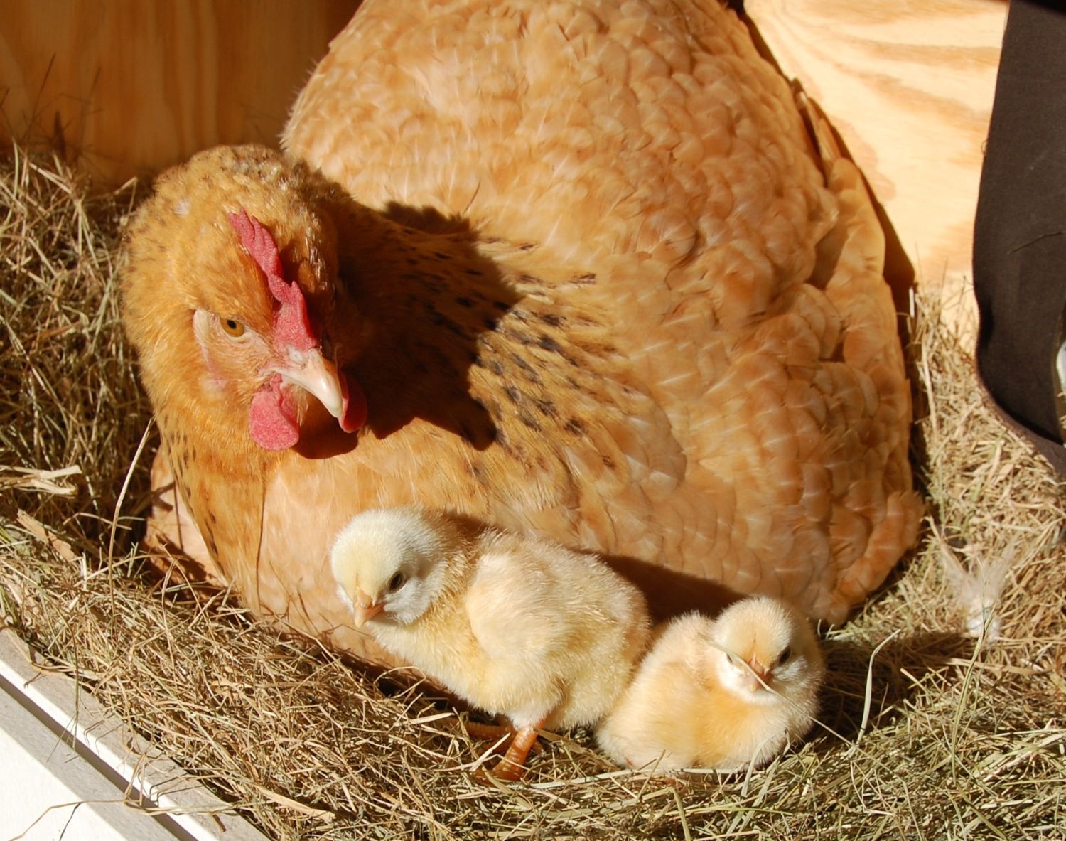 How sweet!!! my buff also has eggs that hatched today, still waiting on 6 but 5 hatched. can not wait to see my girls to.