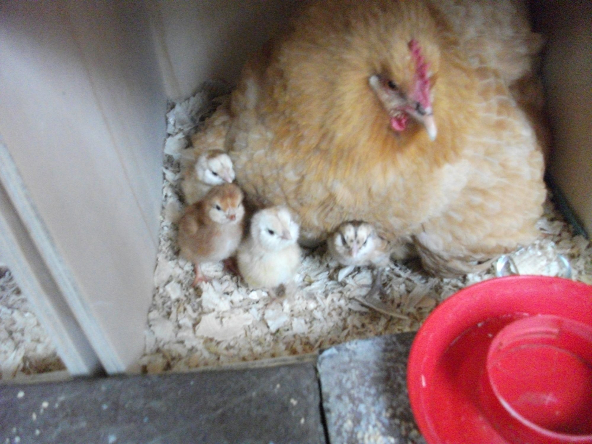 the chicks are of different breeds, there a possible of 4 different birds lol. Rhodie island reds, light Brahma's olive eggers ( I know I put 4 f those eggs under her and 3 hatched.was not sure of the last egg, as the chickens she had were weird colored. white with brown patches. I can tell I have 3 olive eggers so far and 2 Rhodie island reds, not sure of the last remaining yet. but one looks like the Brahma.