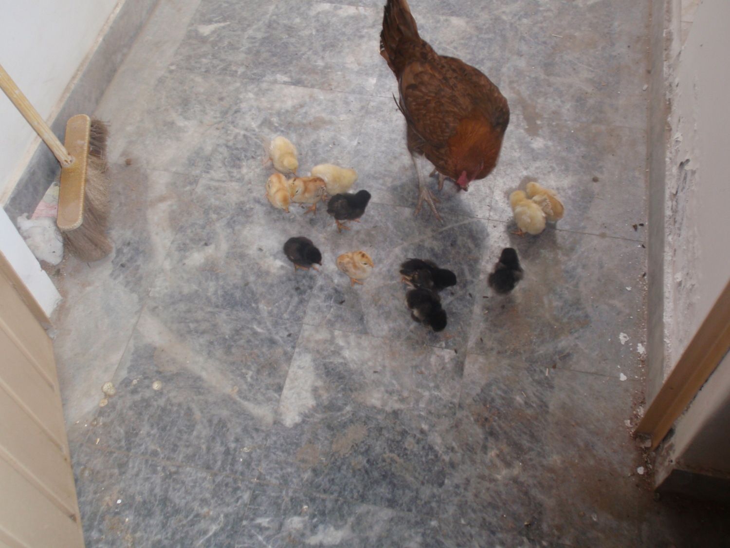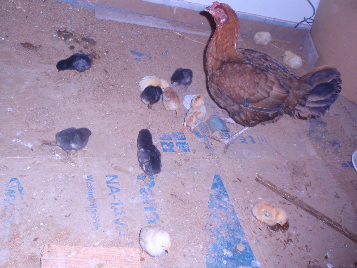 There were 5 and I had been out of town so wasn't sure exactly how old they were but I moved them and mom and the remaining eggs into our barn in a 100 gallon horse trough with a light, shavings and a wire top. Unfortunately, I don't think I got enough shaving under the eggs because every morning I would find a perfectly fine, wet, dead chick. It looked like Mom had pecked them open. I think I lost 7 by not making sure they were as warm underneath like their mom had them.