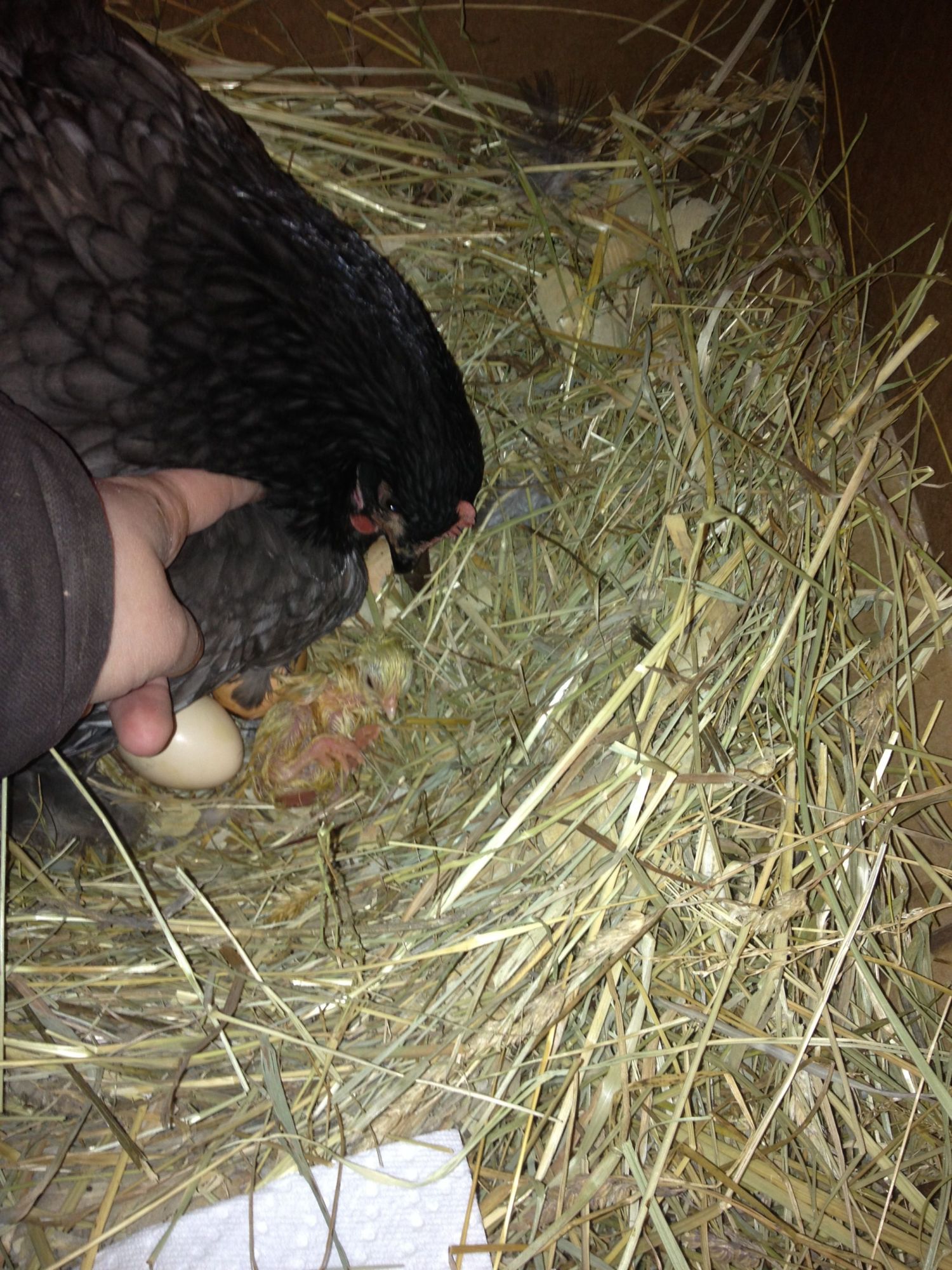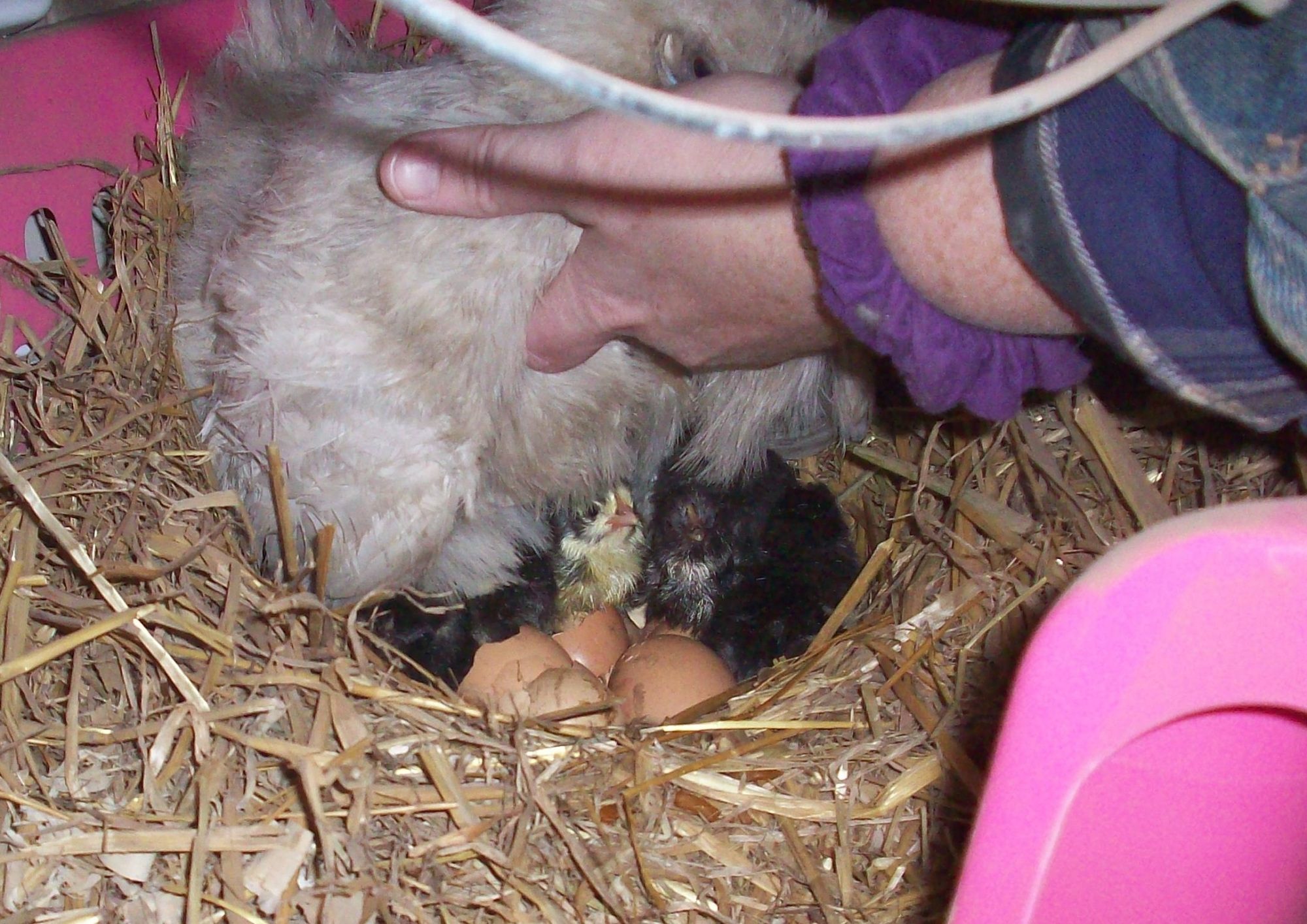 after getting the chores finished we uncovered the wall of the broody pen and couldn't see anything different... but boy could we hear them!!! So Radioman got the camera ready and I did a quick lift to check.... and.......
