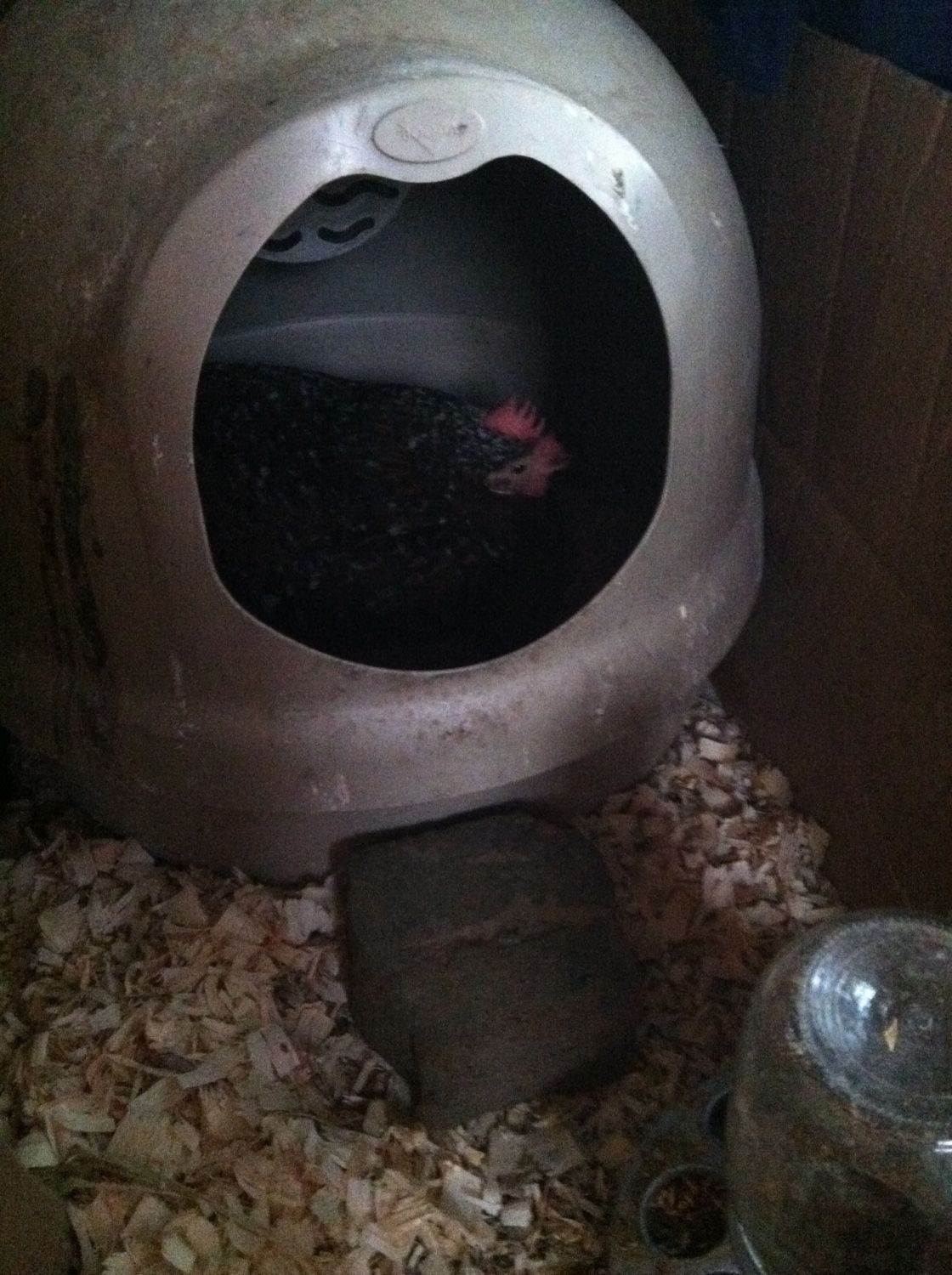No sign of chick(s) yet, but broody is no longer growling at me when I get close to her. ?? Question: I'm not sure the chicks will be able to get out of the nest (litter box). I put a brick on both sides of the doorway, but it's still 4-5 inches from the top of the brick over the doorway. Should I remove the top of the litter box (which would eliminate the barrier) or will that stress the mama to not have her protective covering? Here's a photo: