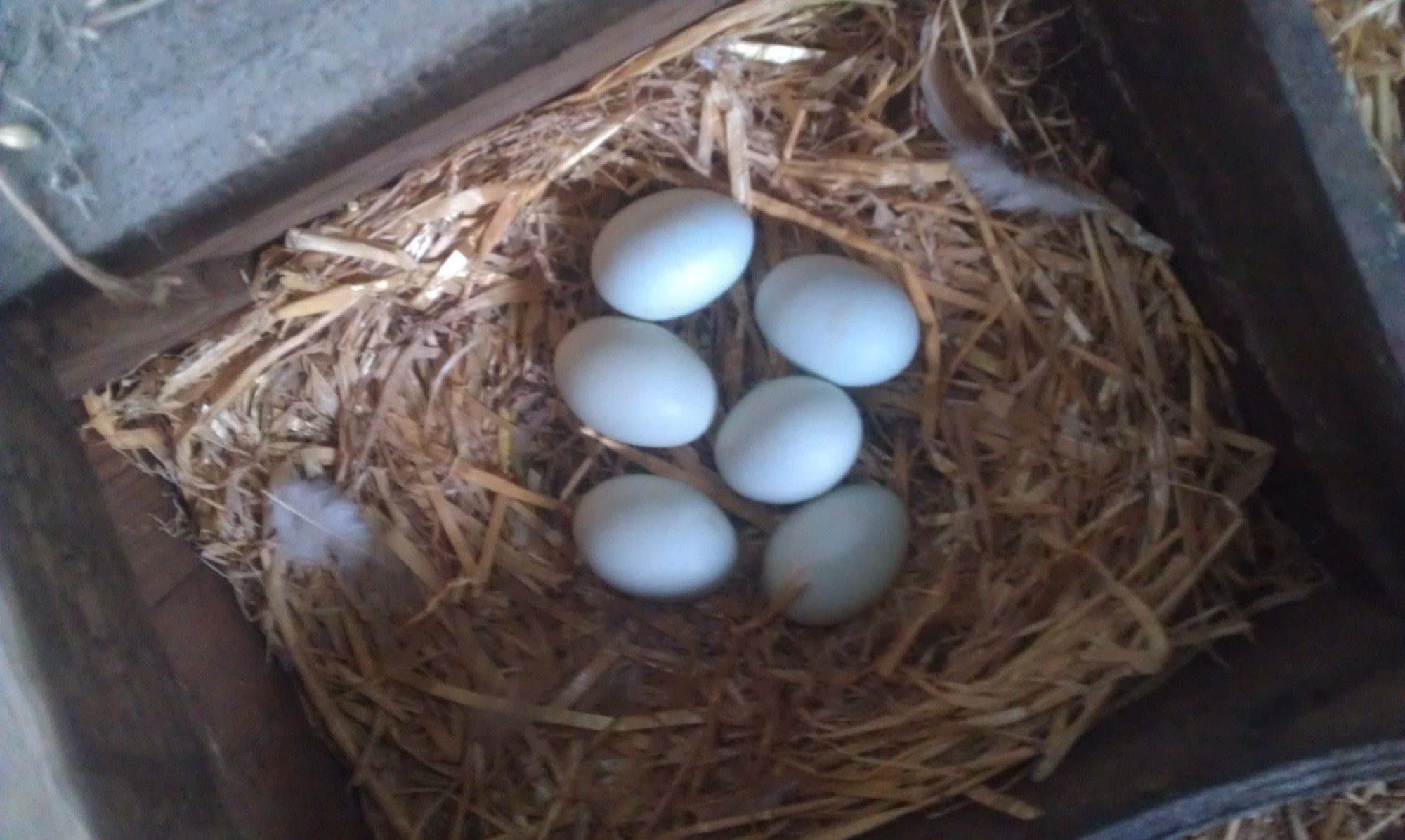 I got her 6 beautiful blue eggs yesterday. Moved her off her nest and took away her 'kids' (a quartz egg, a plastic toy ball and a rock..), she was quite mad, until I laid her new 'kids' out. She was instantly smitten. Now, she had not growled at me before, but now she is... She loves they babies! She's extra fluffy looking now and trying her hardest to keep them safe.![]()