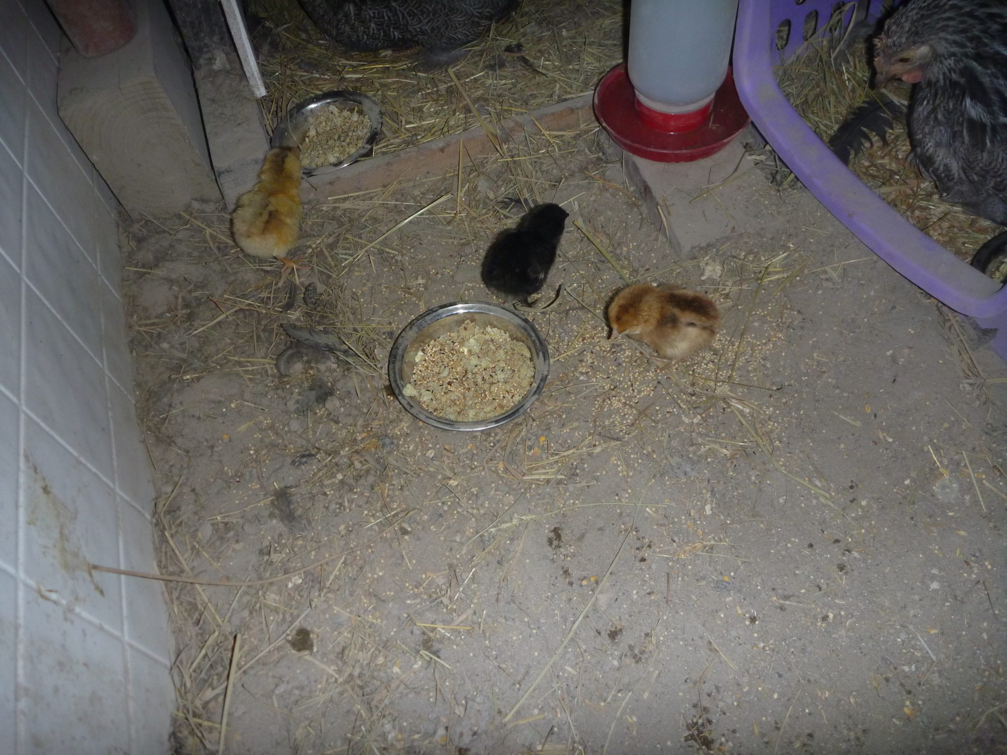 Fertility was a major issue with the breeder's eggs I had gotten for Connie and Bess (he is replacing them for me though when we get more broodies, so all is good).... so they each hatched 2 Silver Pencil Rocks and 1 black mix.