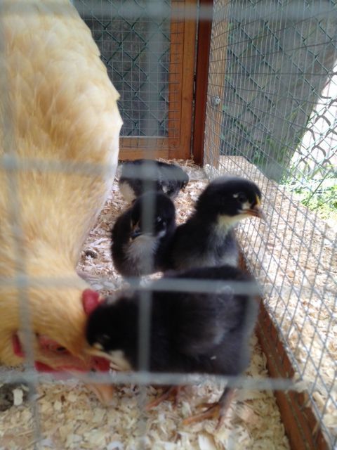 This is Summer with 4 of the chicks: Midnight, Bumblebee, Penguin and Brigadier.