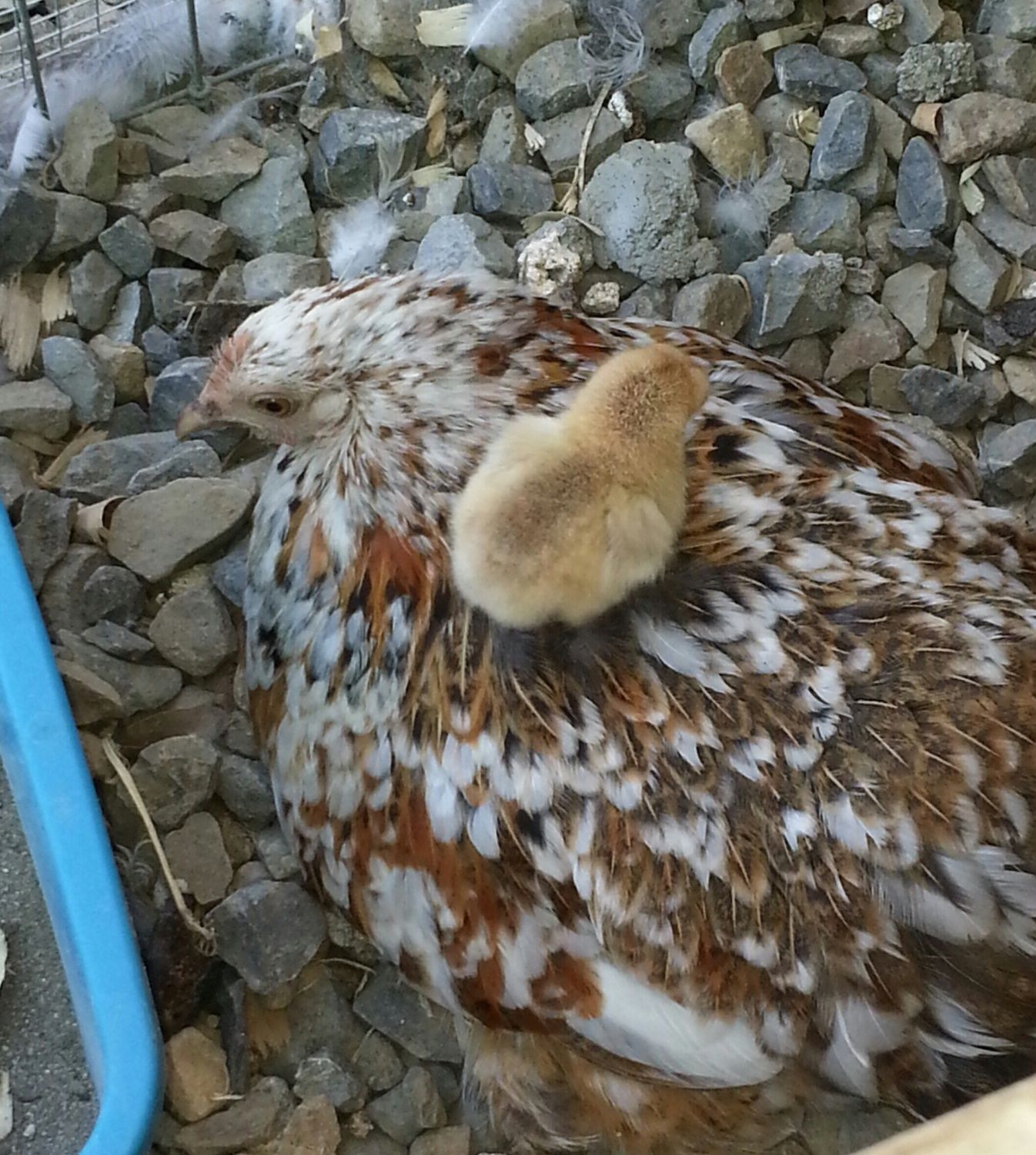 Everyone is upset after the move to the brooding box. It was a rush job as we got home from town to find mama forcing her body between the babies and three other hens who were trying to get to them. I thought I might actually have to wring a neck or two and did end up with cuts and peck marks on my arms. Lesson learned, the next broody goes straight to the brooding box first sign of sitting.