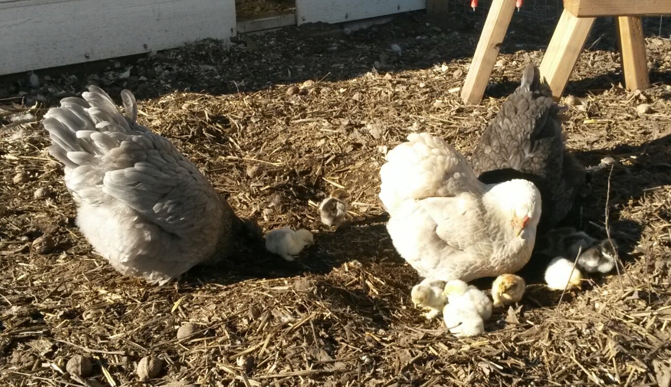 It's been a crazy couple of weeks for me so I apologize for any repeated info but I wanted to give an update on my 1st time co-broodies - the 3 ladies hatched all 19 eggs and after a little bickering have settled in to sharing all the chicks! 1 mom will leave to get a treat or a quick dust bath while the other keep watch and then they will switch. A few days ago they had the babies out for some sunshine and my coat blew off the fence, they must have thought it was a hawk because 1 mama had all the babies covered against the coop and the other 2 mamas and my roo were trying to chase my jacket away. I was truly impressed. Here's a not so good picture of the happy family.