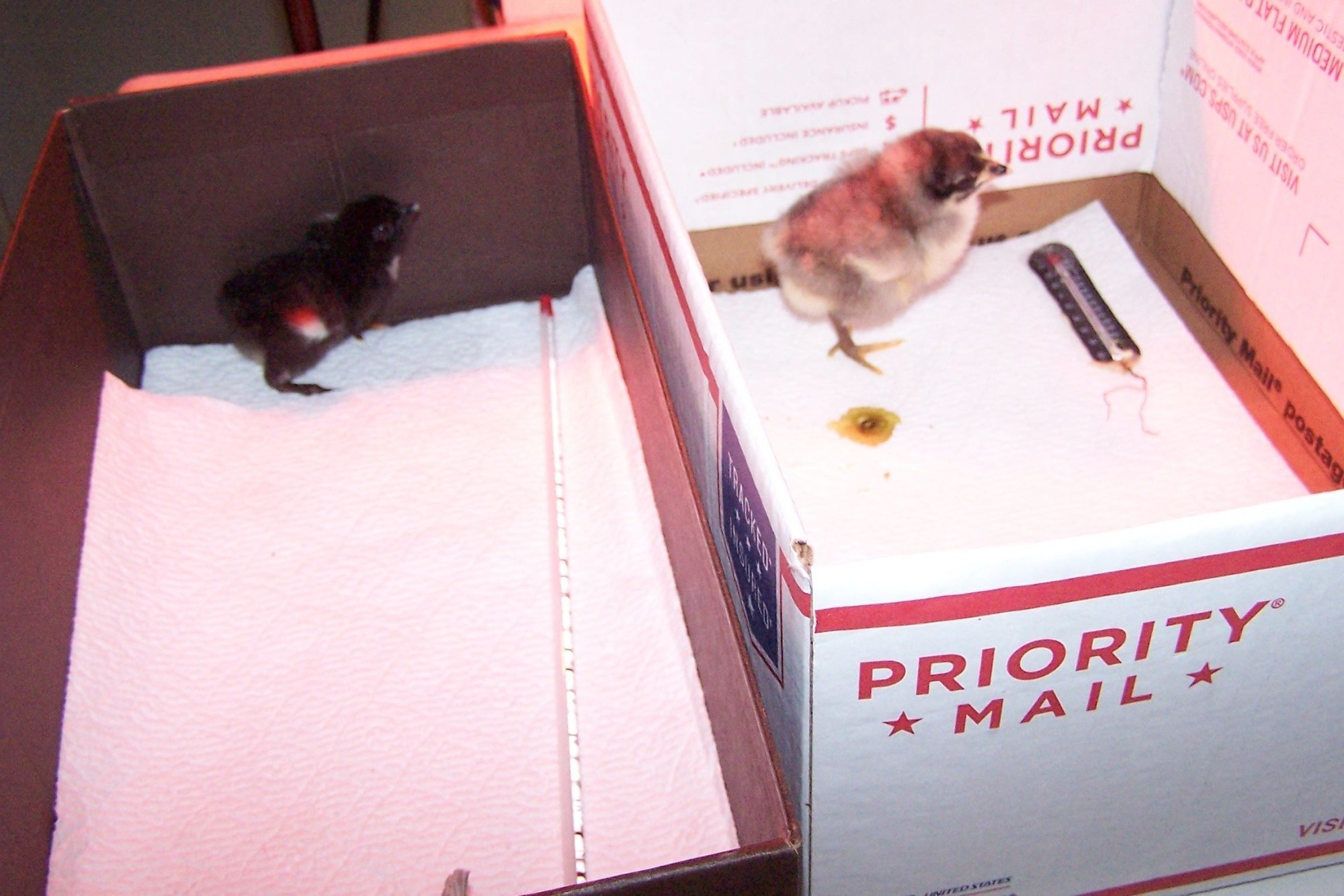 Chicks in make shift brooders (one science thermometer and one sadly over-used chick thermometer now re-set by said science thermometer):