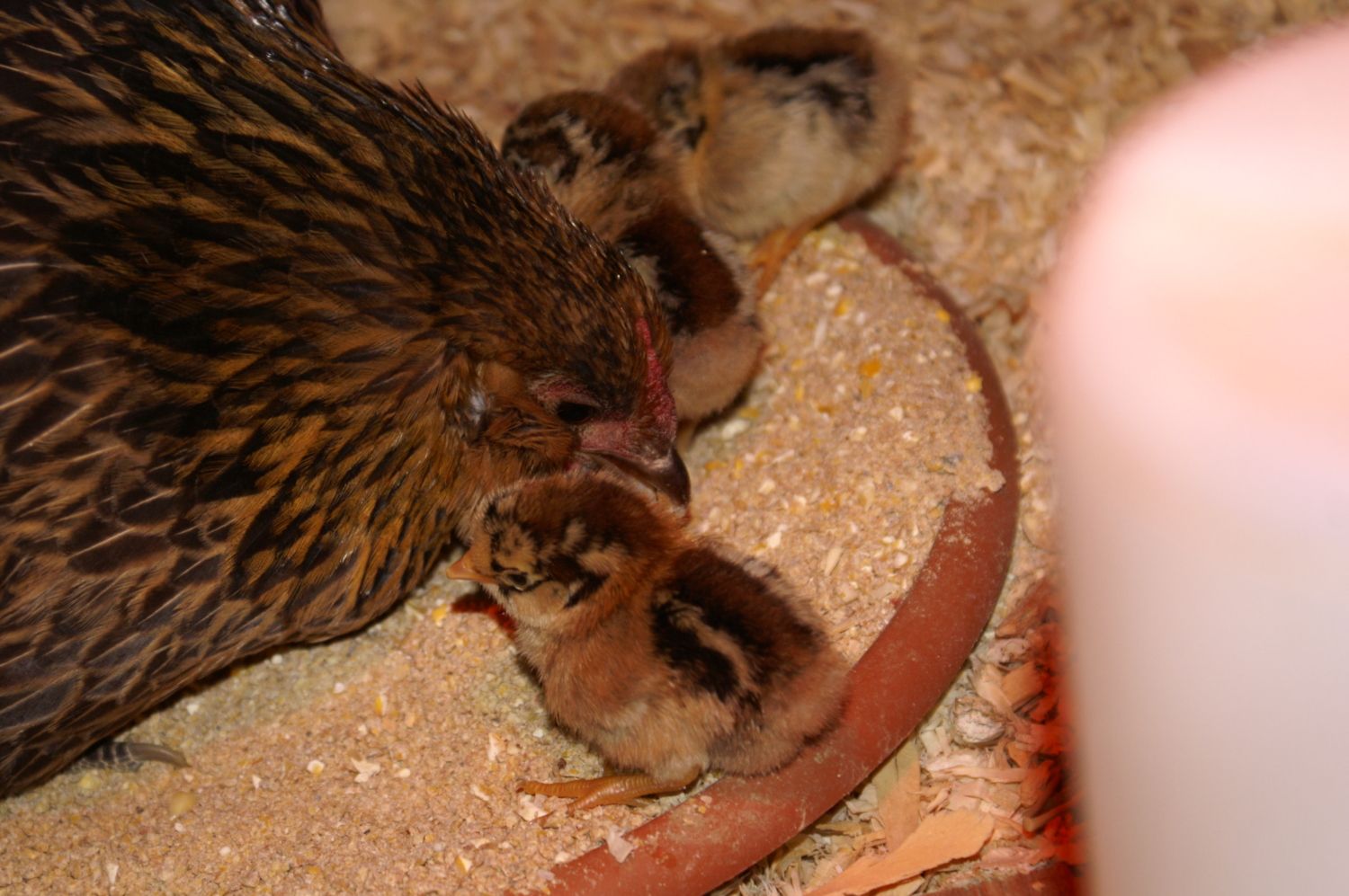 I put the eggs in the bator into lockdown a few minutes ago. I candled them first, but it's hard to see through the Wellies so I'm not sure about those. I did see movement in at least two AMs so I am hopeful we will get chicks. When I checked on her, Smokey was still smooshed down flat a little bit ago and I moved her food even closer to her so she would be able to eat easily tonight before the lights go out. I couldn't tell if she had gotten up to eat yet today. We are due to hatch on Tuesday![]()