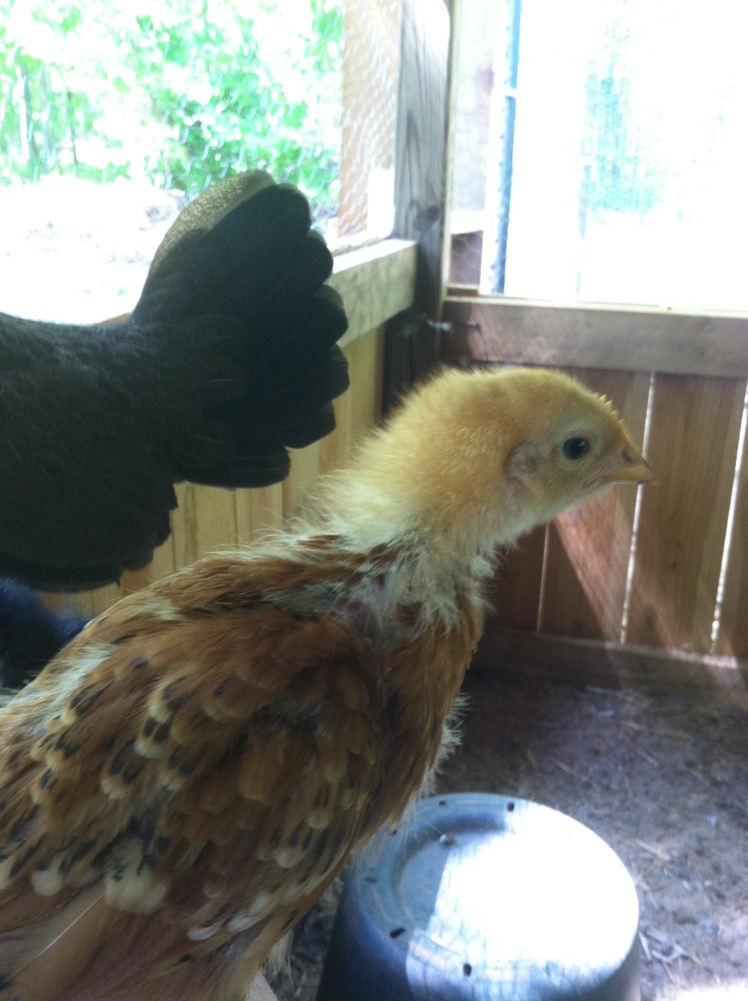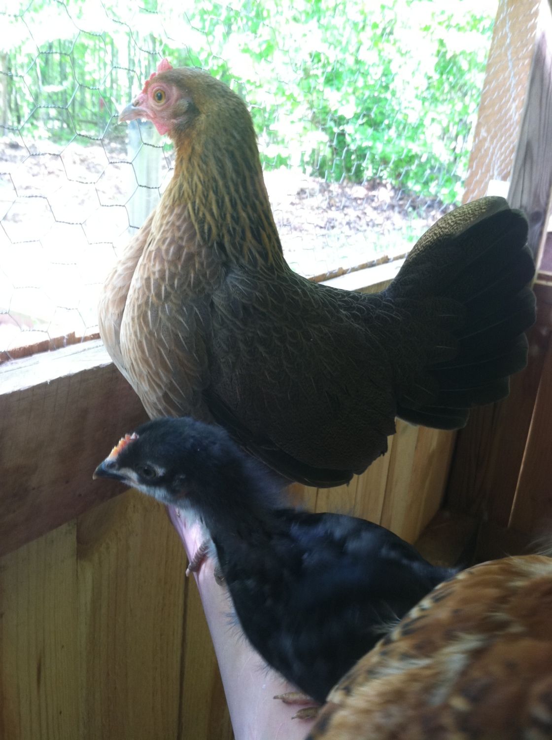 Here's one of my broodies playing nice with one of her hatchmates (broody on right, egg layer on left). The other broody is in the cat bed to the right but you can't see much of her - she's snuggled in there good and tight. :) Wish it was a better pic but only had my phone on me. :)