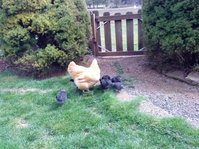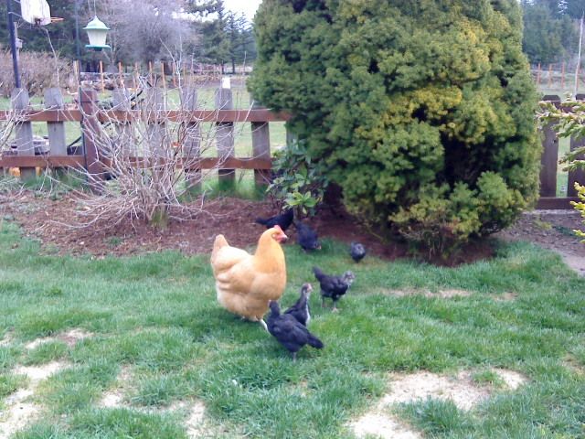 Just thought I would put in a picture of my Buff and her Australorp chicks (and 1 bantam) that are now 5 weeks. She is the best mother hen ever!!! Never pecks at me, very calm and friendly. She let me give her the day-old chicks in the middle of the day and the bantam a week later. I got a young rooster who thinks he is still a chick, and last night Henny Penny even let him sleep in the nest with her and the chicks!