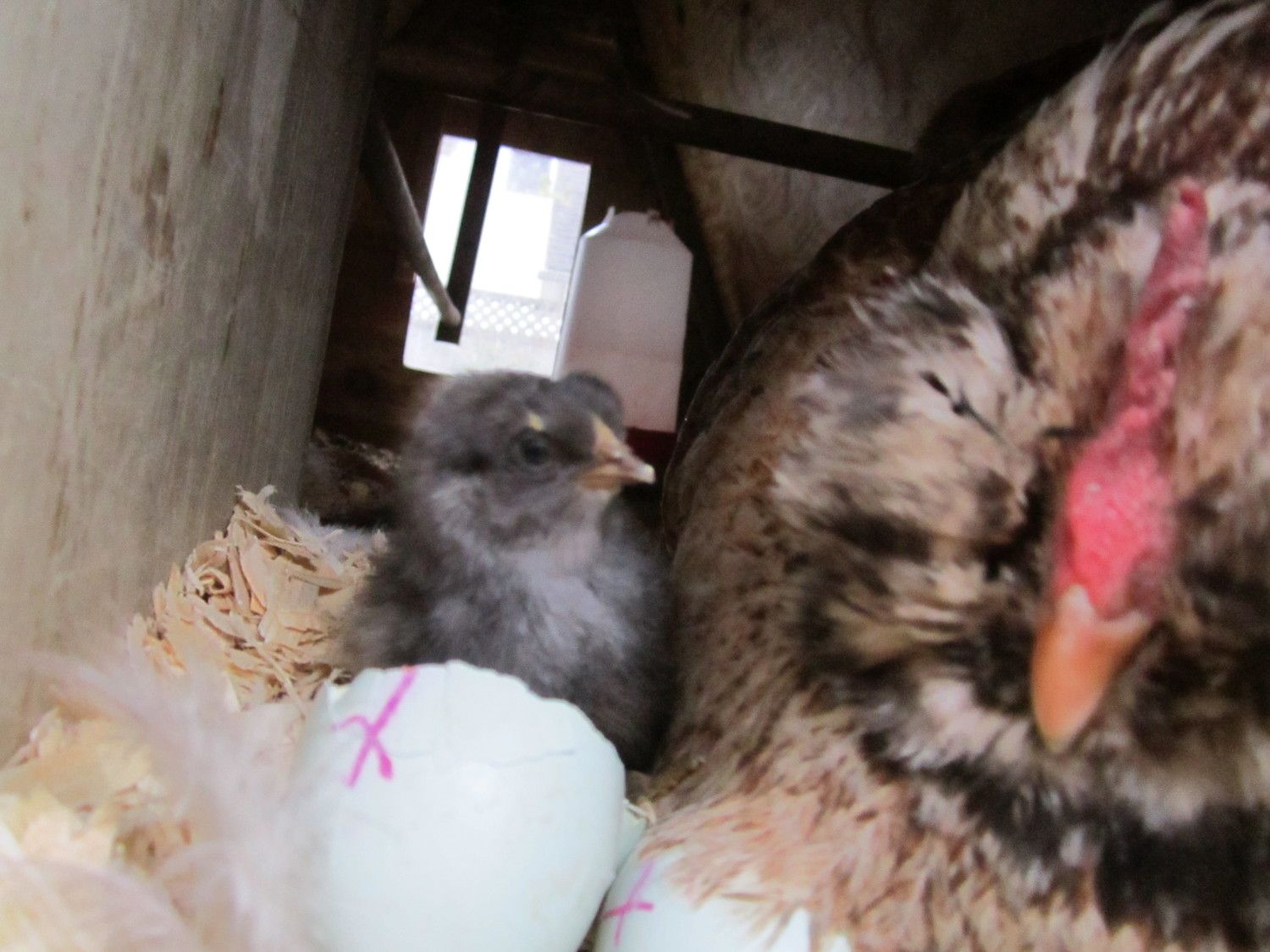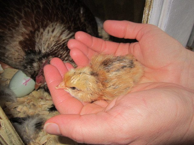 This morning, these was a second baby. So that's 2, and they both look really healthy. Baby #1 (from the videos) is a French Blue Copper Maran. Baby #2 is an Easter Egger/Maran mix. (S)he must have hatched in the wee hours this morning, because she was still a little damp when we checked in at 8 a.m.
