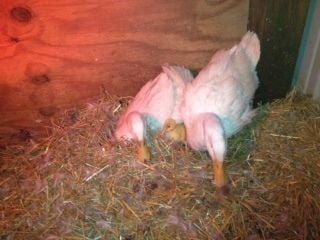 I am sick-- utterly sick-- I went straight into TSC, even rushed to get there before closing time, I bought 3 Pekin ducklings and gave them straight to my 2 Moms. Luckily for me, these 2 moms seem born to be mothers, and they eagerly accepted the ducklings right away! There are still 2 eggs in the nest and they looked good the last time I candled.