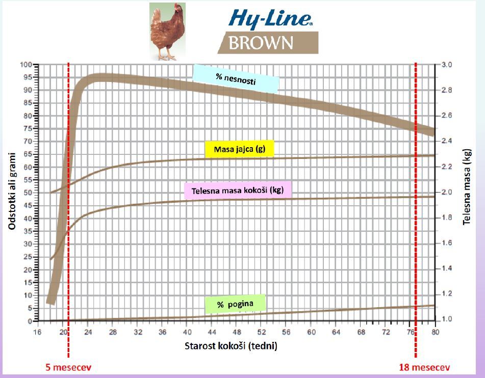 Here's a chart for hy-line brown hybrid layer (I'm sorry it's in Slovenian). It covers the laying performance from 5-18 months (x axis) and it tells you how many eggs per 100 chicken you get (per day), e.g. value 50 on y axis means that, on average, 50 out of 100 hens laid an egg. That means one egg per chicken every other day. Value 30 would mean an egg every 3rd day, value 100 an egg every day.