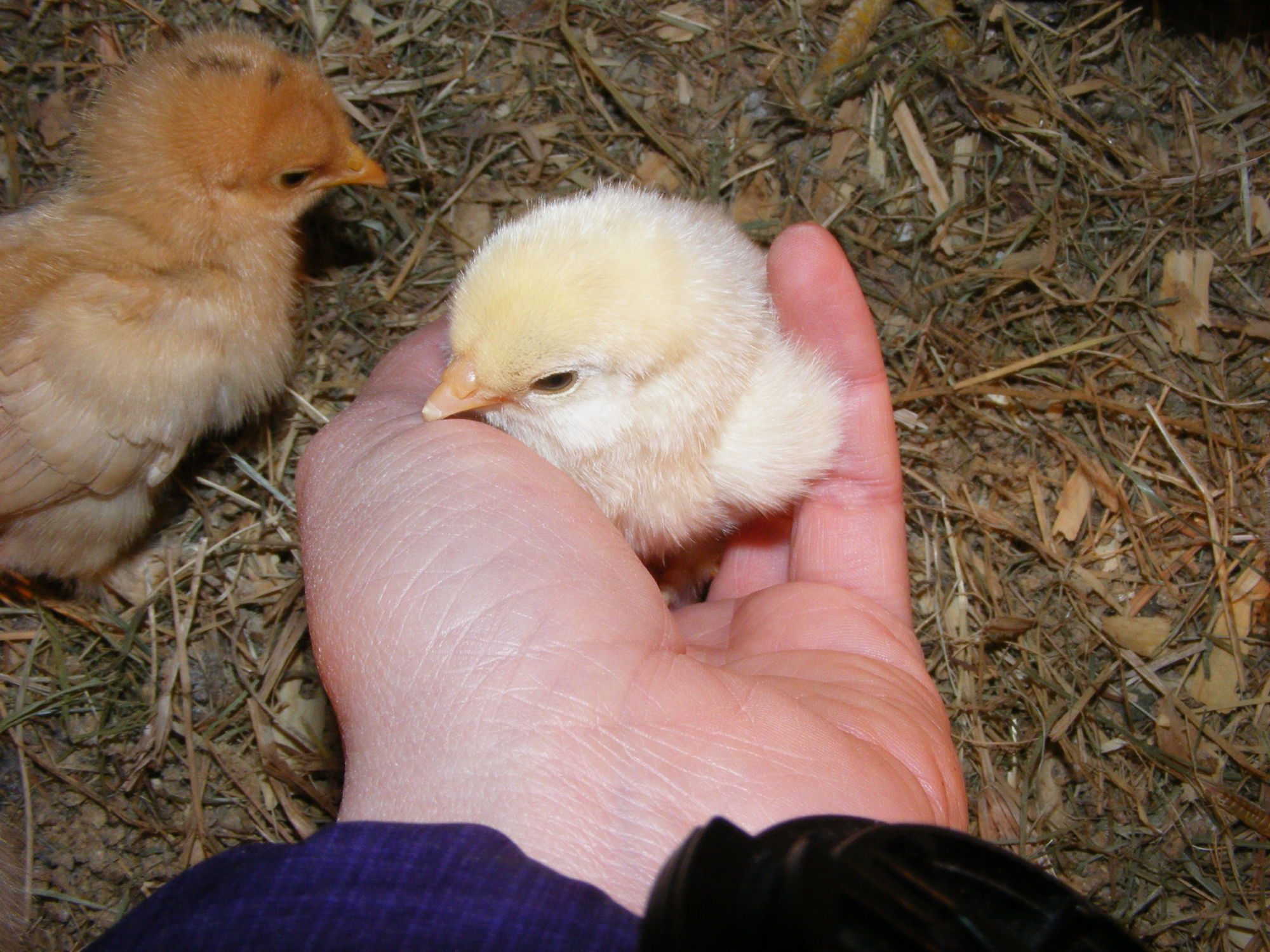 I call them "Uno" and "Dos". More may follow, as you can see from the clutch of eggs in the background. Uno is the offspring of another bantam cochin and an unknown daddy (I have my suspicions, but won't know until he's older). Dos is a mystery. I don't even know who laid the egg, so his parents could be any one of several candidates. If I had to guess, though, I'd say Daddy is an Easter Egger roo named Gryffindor.
