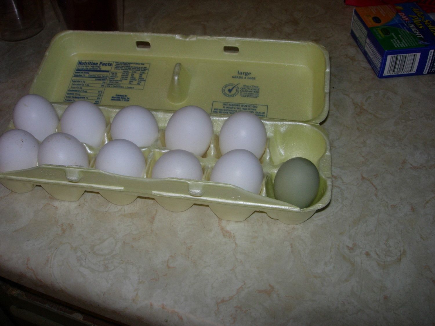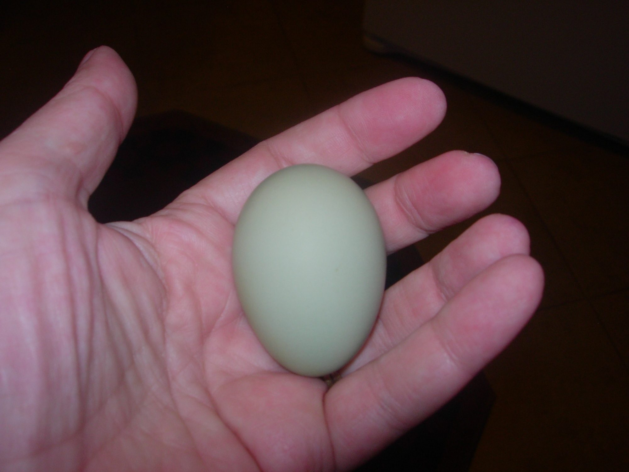 My first EE egg from the babies we raised. She is 21 weeks, I only say she because I do not know who did it. I have a black EE that I think may have done this as she is the only one that doesn't seem to mind the attentions (LOL) of her Roo! The other 3 EE's are buff and black. Cannot figure out how to go to my old pics to show you a pic of her. Still learning this new forum