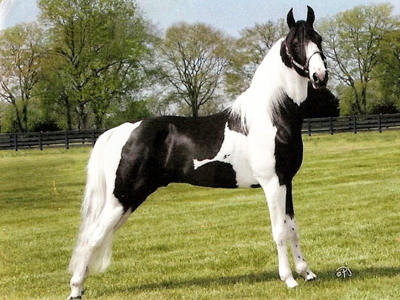A pinto horse has large, flashy patches of white on top of any other color. Bay pinto, black pinto, roan pinto, you get the idea. (PS to any horse people, I'm saying "pinto" instead of "paint" because pintos are any breed of horse with paint-like patches. Paints are an actual breed.)