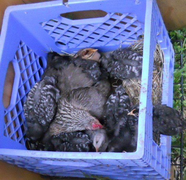 just have to say, GREAT!! barred rocks... i got 12 eggs, 2 were clear, 9 hatched! OEGB broodymomma "Ducky" says thanks John. even if they are almost as big as she is now. (2 weeks old)