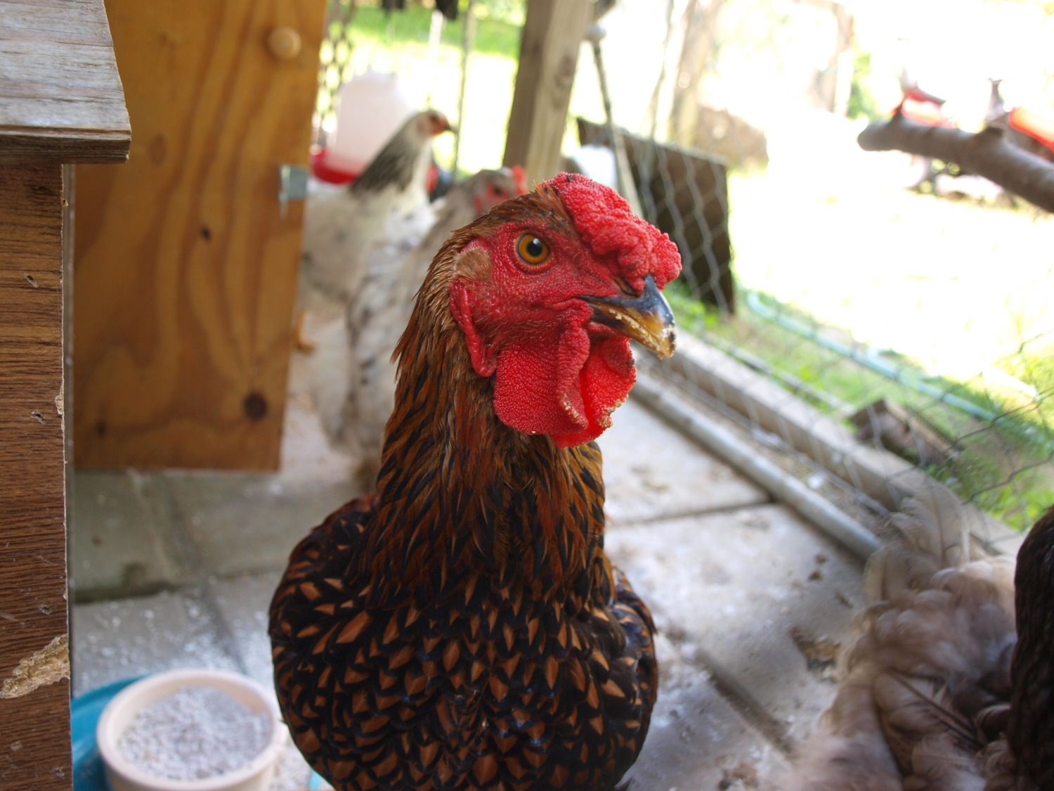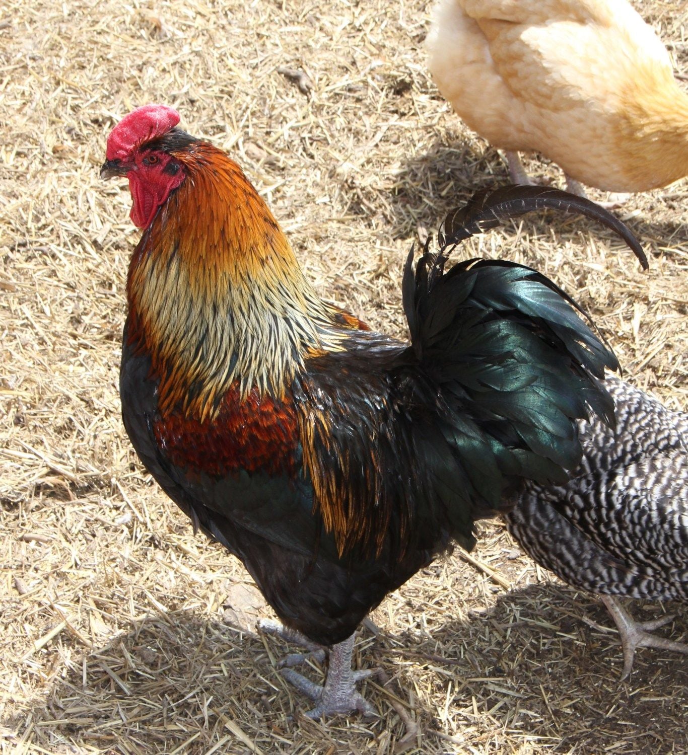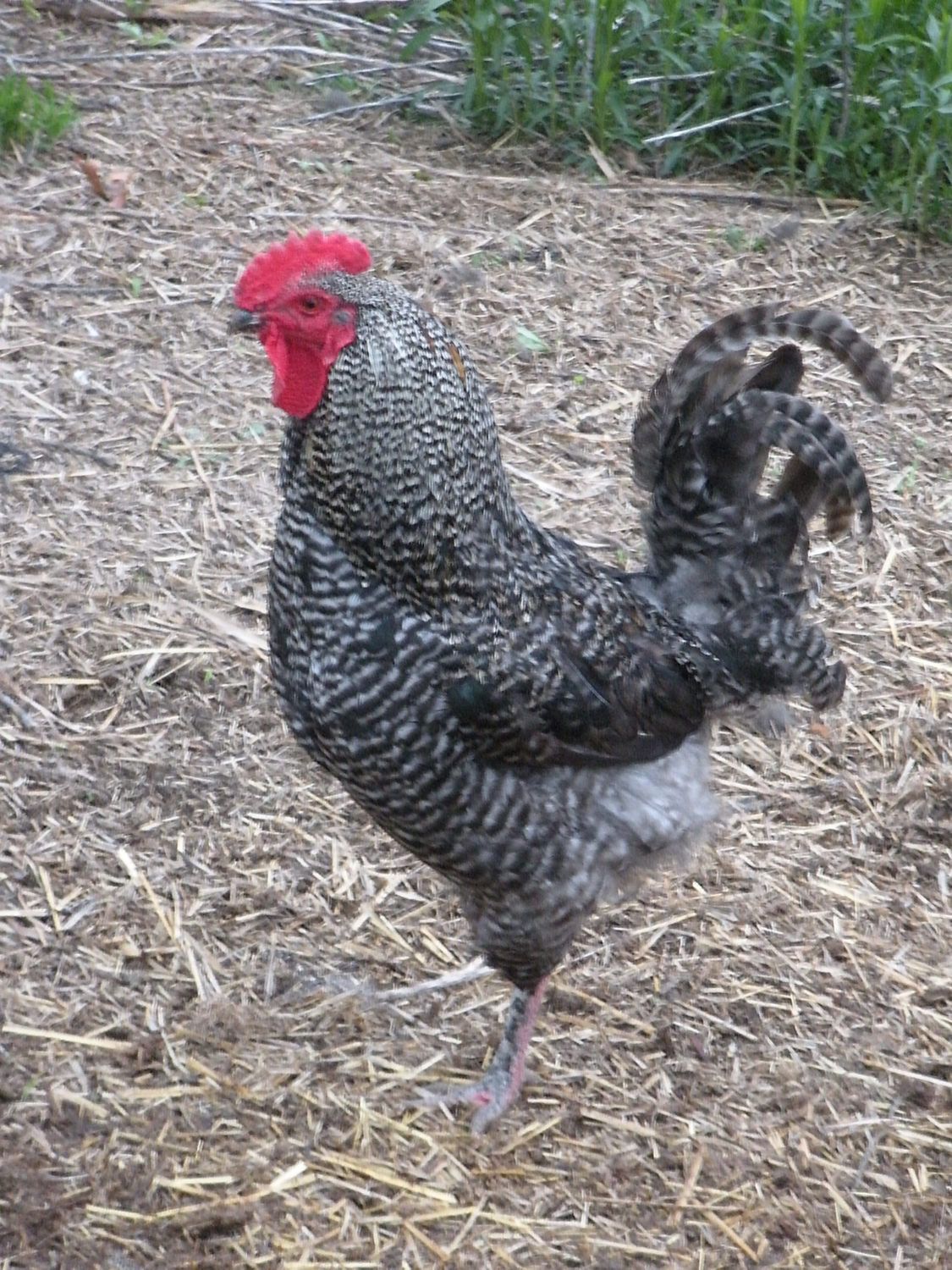 May I introduce you to "Prince" (a.k.a Purple Rain) - A Black Copper Marans (Roo) x Barred Rock (Hen): My husband had named him Prince because our BCM was named after the "King". (The whole King, Queen, Prince, etc structure). . We poo pooed his idea... keeping the name "Prince" we added "Purple Rain" to it. Keeping with the whole musical entertainment thing.