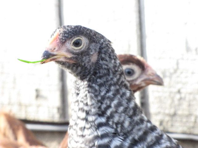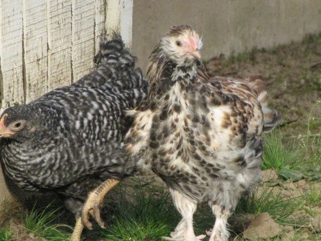 All this talk about breeds got me intrigued. One of our chicks we got as a "mystery" chick LOL. My youngest wanted a "yellow" chick and picked her, he named her Applesauce Anyone have any ideas on her breed? She is beautiful, and while she was my panicky "freak" chick, she has grown now, at about 10 weeks, into a very calm, confident girl. She has those fluffy cheeks and featherd feet and legs. She looks like her breed is bigger than our Barred Rock and RIR. I attached some pics below and included a couple others of Cinderella and Cecilia just for fun