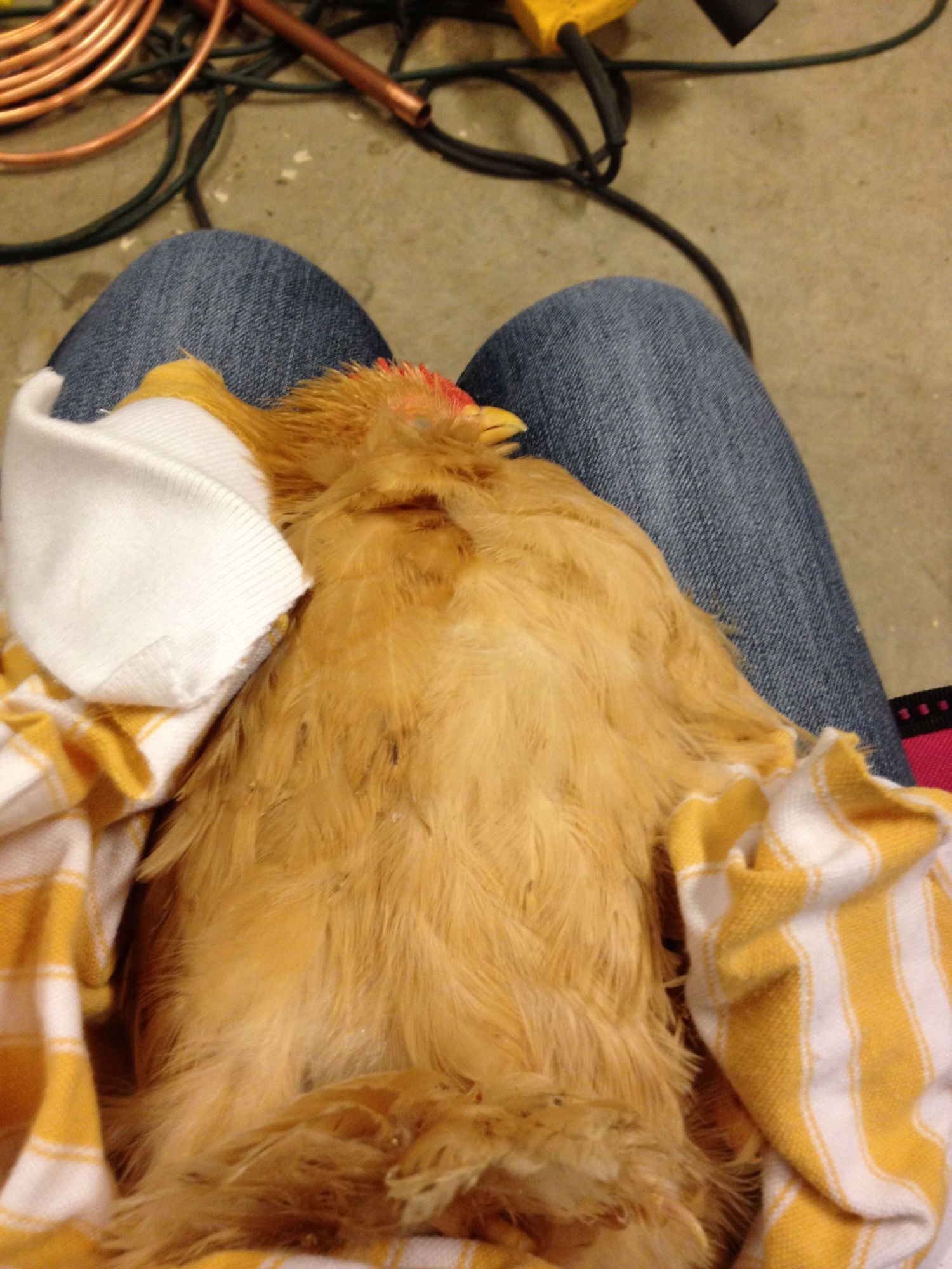 I'm filing beaks today on the Cochins, and snapped this picture of Hope. Don't worry, he's not dead, just really comfortable, lol.
