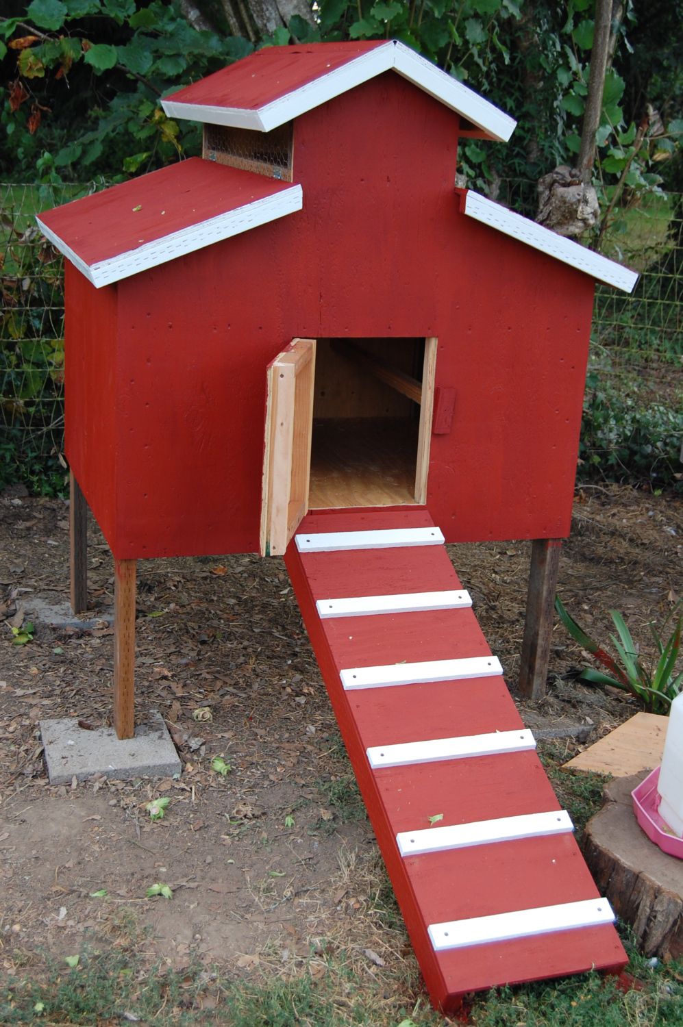 The second one was a "Honey, I want a coop that looks like a barn." And there it is! The second larger roofs both open, one side to their nesting boxes and the other to the roosting bar, so I can get to their hanging feeder easy.