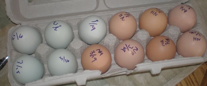 Here are the Ameraucana eggs. The date is marked on them with a bright purple surgical pen so it washes out the colour slightly. They look really pretty in the eating egg mixes I sell :)