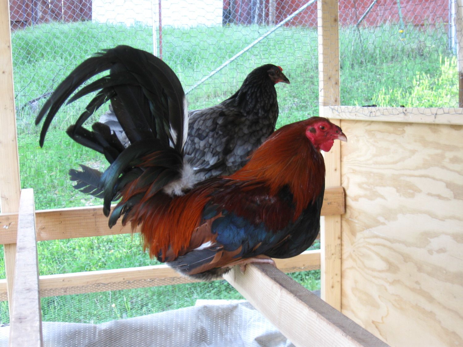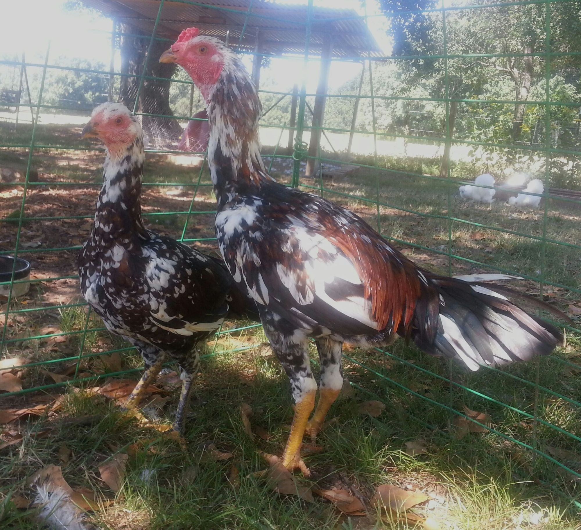 Hi, I'm new here. Here is a picture of my top cock, a brazillian game fowl with his pretty little blue hen. He's tough as nails-- has fought off a coyote and sent him packing (although i had to amputate a toe afterwards) and survived a dog attack that killed almost 20 other birds. He once attacked his reflection in the fender of a truck and dented the fender. He's gentle as a lamb with humans though-- i can pick him up and snuggle him if i'm quick. His name is Yeti.