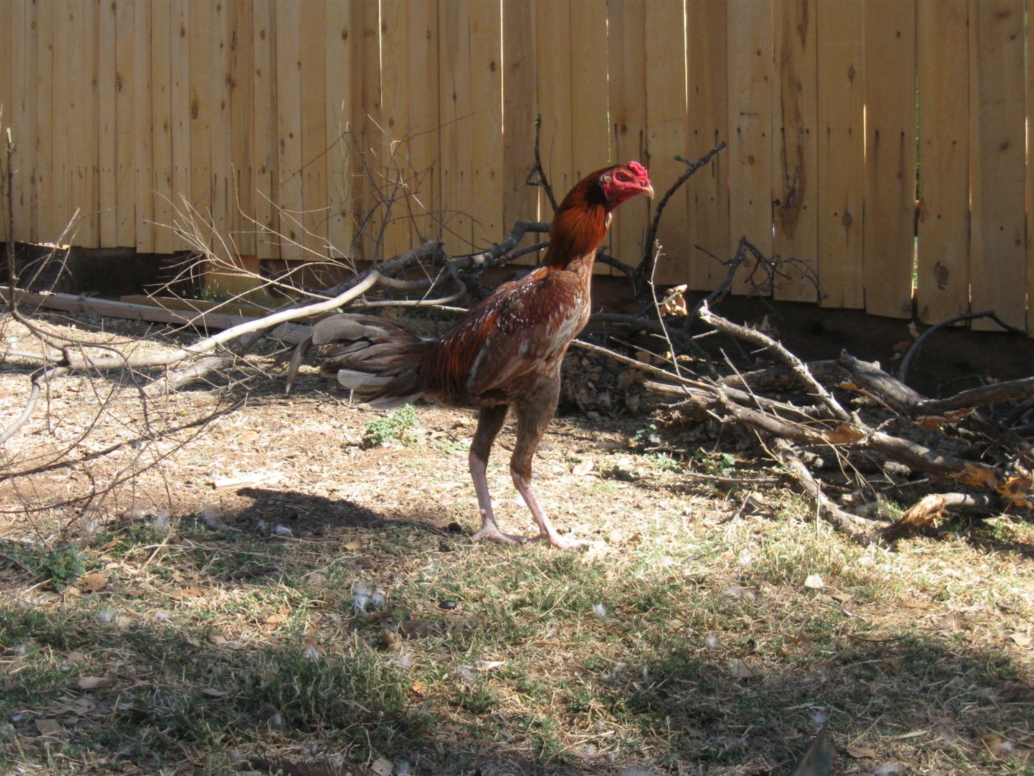 Here's a picture of his understudy-- a shamo cockerel about 7 months old. I'm not sure what the color pattern is called-- wheaten? I just lost his matching pullet in the dog attack, she was a gorgeous wheaten with really cool intricate etching like patterns on her wings. I'm pretty bummed out about that.