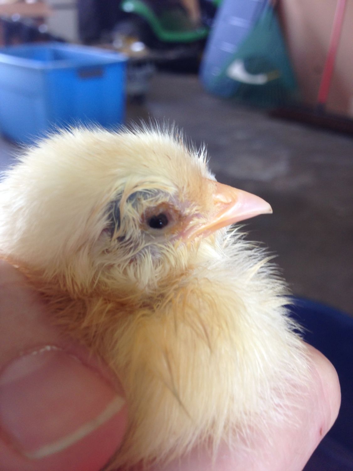Sorry to keep posting this, but I'm quite frustrated. I know it's just a chick, and chicks die, but I really want to do everything I can for her. I'm having a really hard time finding someplace to buy Terramycin online. Dr Foster is sold out until Sept. Can anyone point me in the right direction of where to buy this? The Veterycin seems to have made things worse after using it for 2 days so I stopped. Below are 2 pictures I took today after cleaning her eyes as well as I could. The eyes are super crusty. Her left eye is definitely the worst. Sorry for the lighting on that photo, putting her in the brooder was the best way to get that side. She is pooping normal again, but still has a very low energy level and still not eating nearly as much as the others. She's also the smallest chick by far due to not eating as much. I've changed the bedding to paper towel so at least she's not getting shavings and sawdust stuck in her eyes anymore.