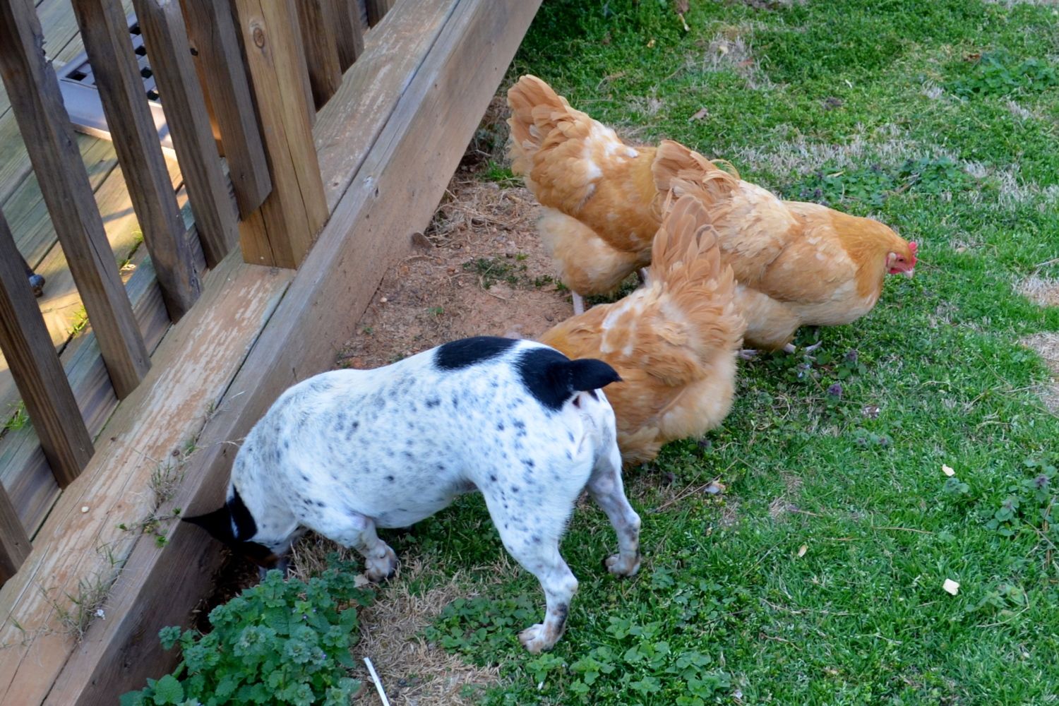 My Orpington Girls love to follow my Rat Terrier Ajax around and let him dig and then they get the rewards. There are so funny! They can be mean to him but he is very good natured with them and just backs away. He was the one I worried the most about with my girls and has turned out to be one of my best with them.