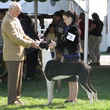 Just wanted to post some pics of my Danes. I've been a breeder and exhibitor of harlequin and mantle Great Danes for 17 yrs. Info on them was already posted so the only thing I'll add is that life expectance is very dependent on genetics, and nutrition. My Danes live to between 10-12 yrs. Also before you get a Dane make sure you have a vet familiar with the breed as this makes a huge difference. Also as for references of other Danes clients. Seeing a Dane or 2 in a decade does not make them familiar. Despite what some may say all dogs are not created equal and different breeds react differently to various treatments. Anyway, here are some of mine past and present