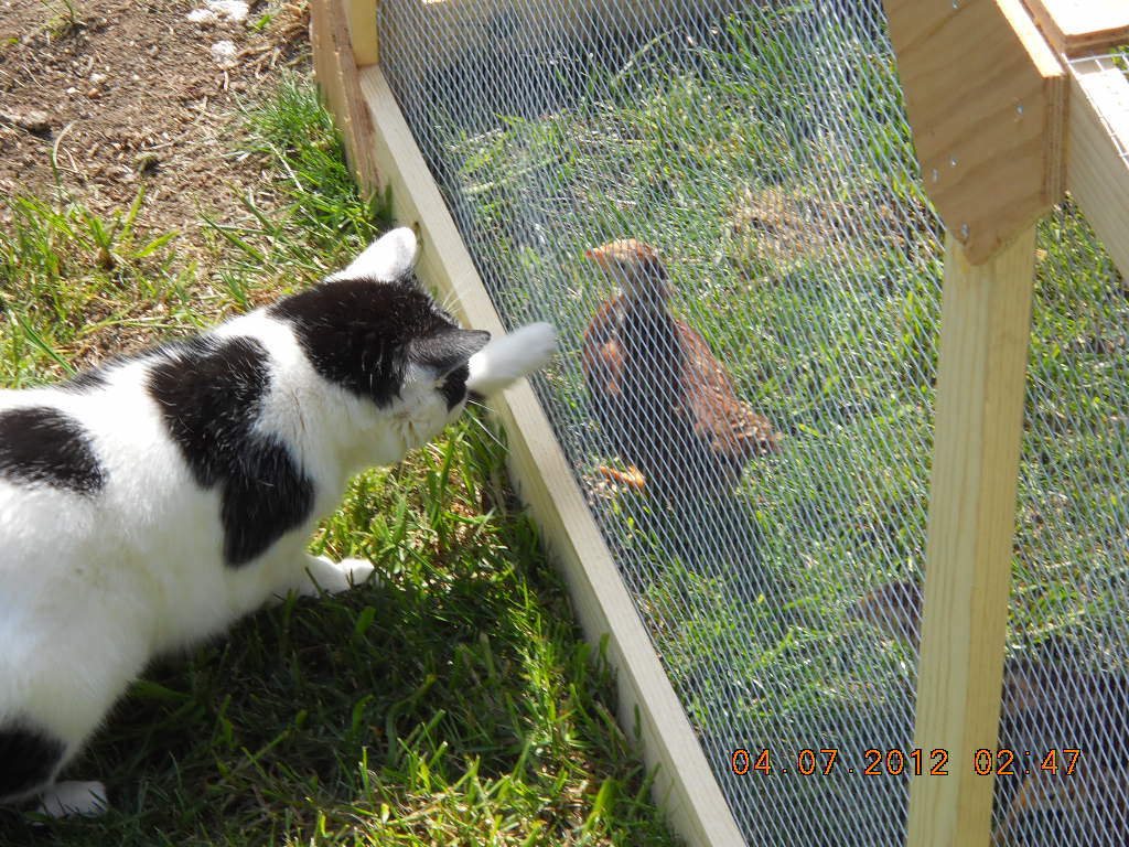 May 23, 2012 #8 Courts Clucks In the Brooder 7 Years Joined Apr 29, 2012 Messages 82 Reaction score 4 Points 31 Location Richards, MO My cat sits in the window and hisses at the roosters. They crow too early for her liking. Your cat is just laying out the law, "you stay on your side and i don't show you what happened to the cardinal last week...."