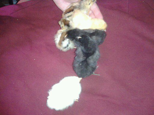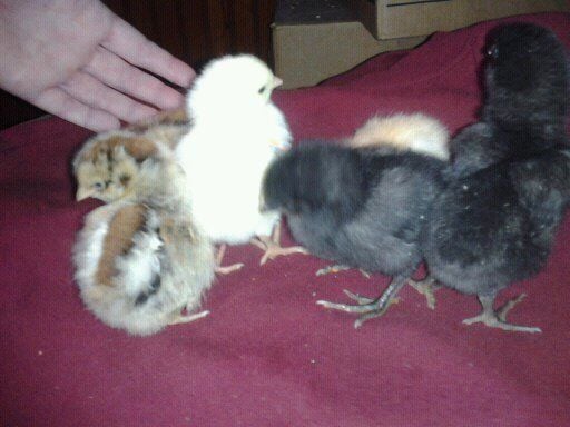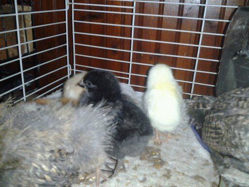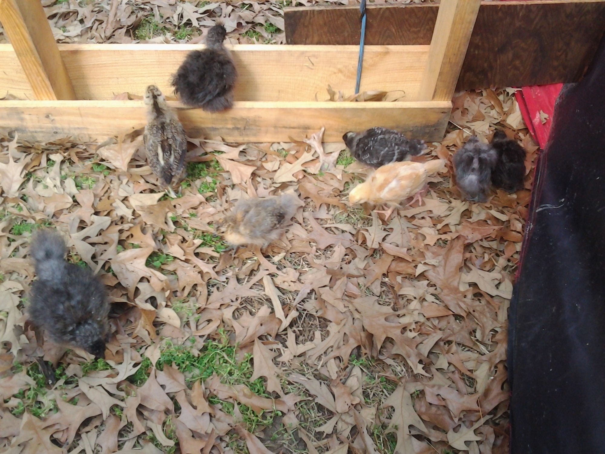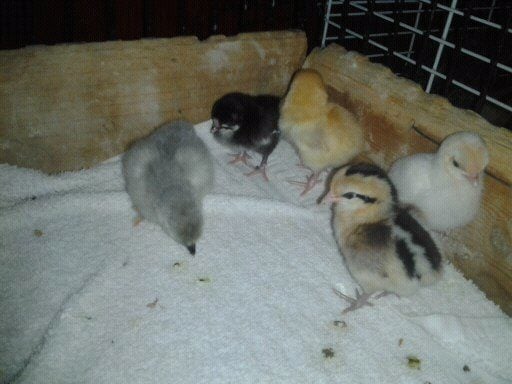 Most of our chicks. They are a/an: buff orp f, barred rock f, ameraucana f, 3 black silkies ?, blue silkie ?, and a partridge silkie ?. 2 silkies are about 5-6 weeks and the other 3 are about 4-5 weeks old. So far we have no idea about sex. The other 3 are from the feed store, and were already sexed. Looking back, we should have bought more than 3, I think.