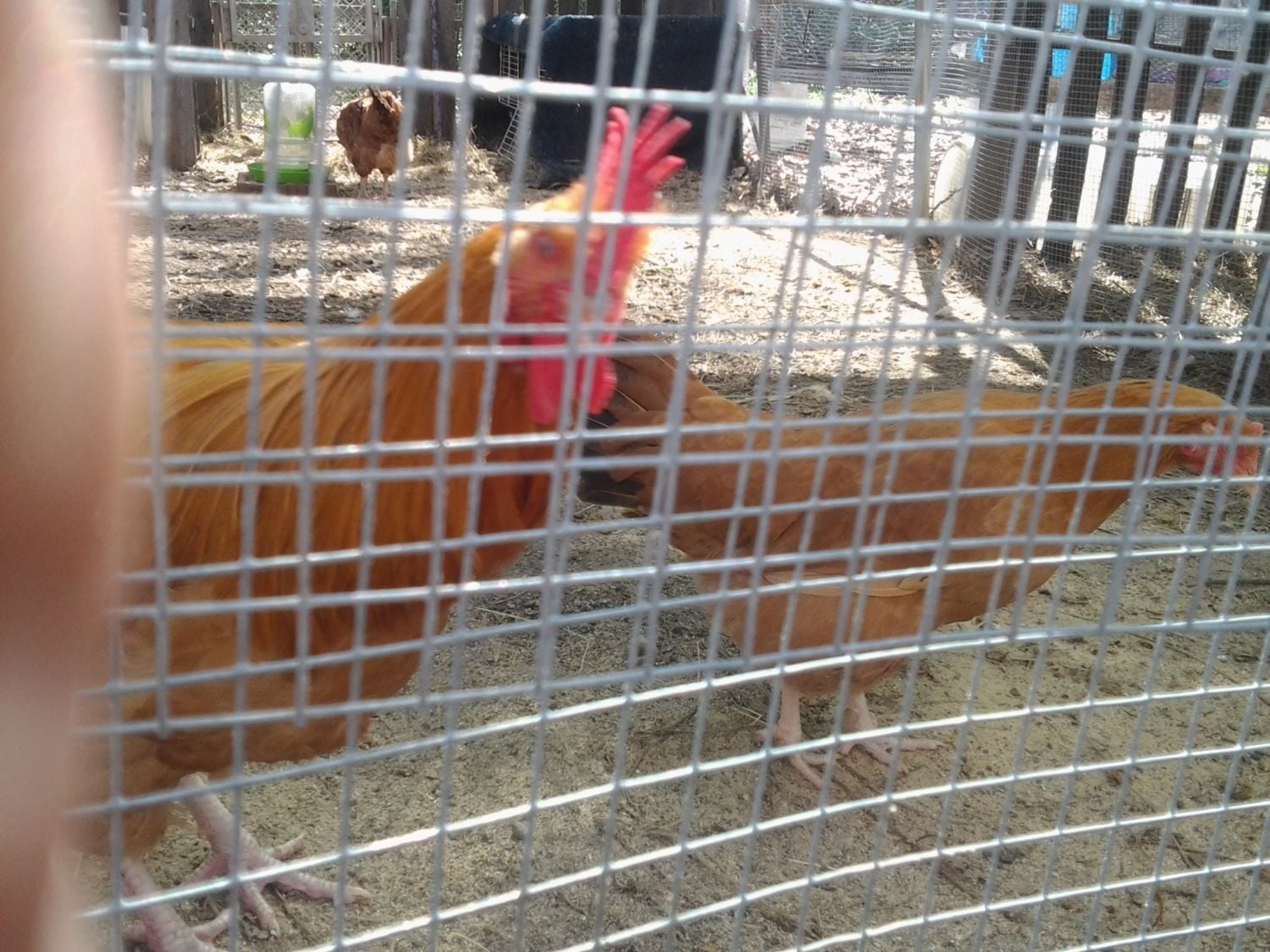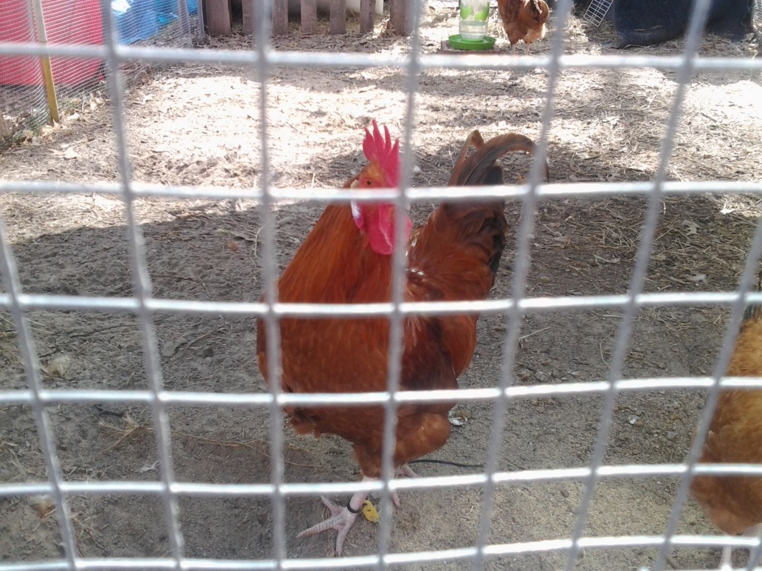 Our dominant (extremely) red/freedom ranger rooster. We call him Meanie. He is the only one who crows on a regular basis. By regular I mean he starts at 4:30 am, and continues until about 9:00 pm. I am the only one who doesn't like the sound of the crowing.