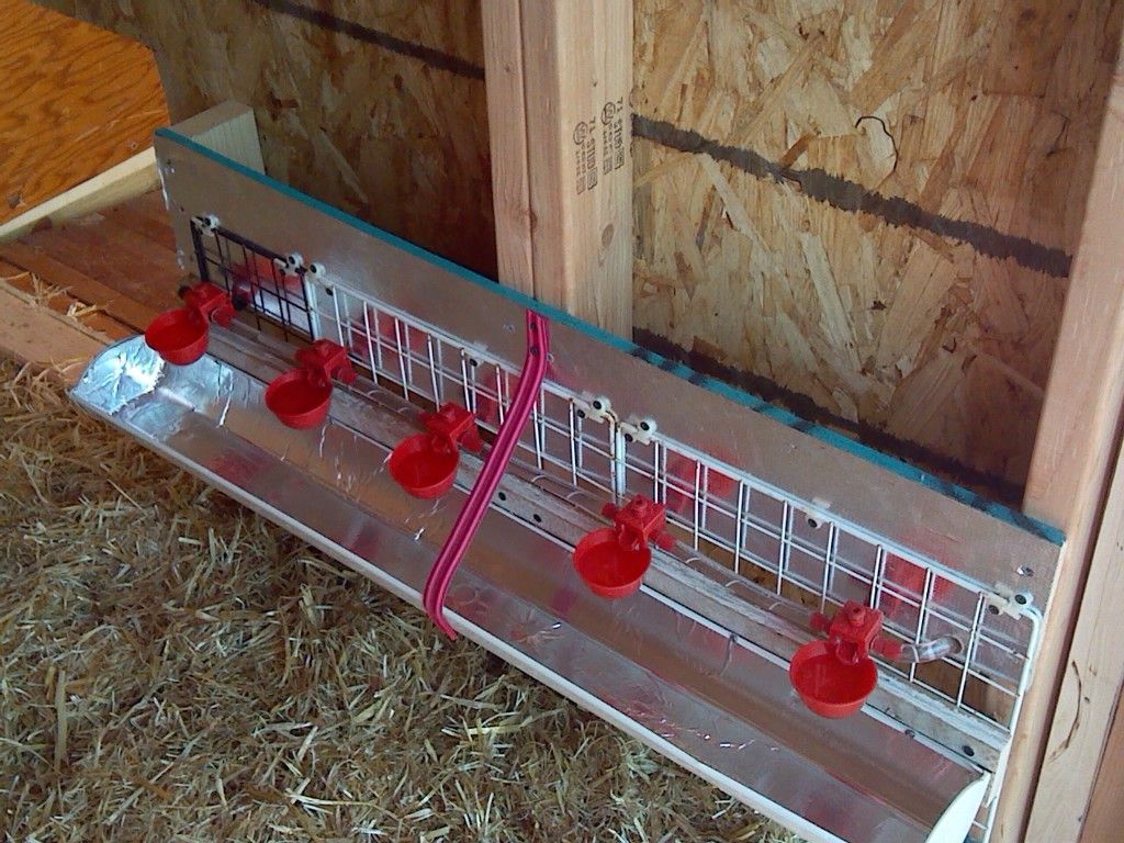Outside is a water bottle that we can refill. We worried that they would eat straw (which they like to do - 6 weeks old) and then not have water while they were inside at night, etc.