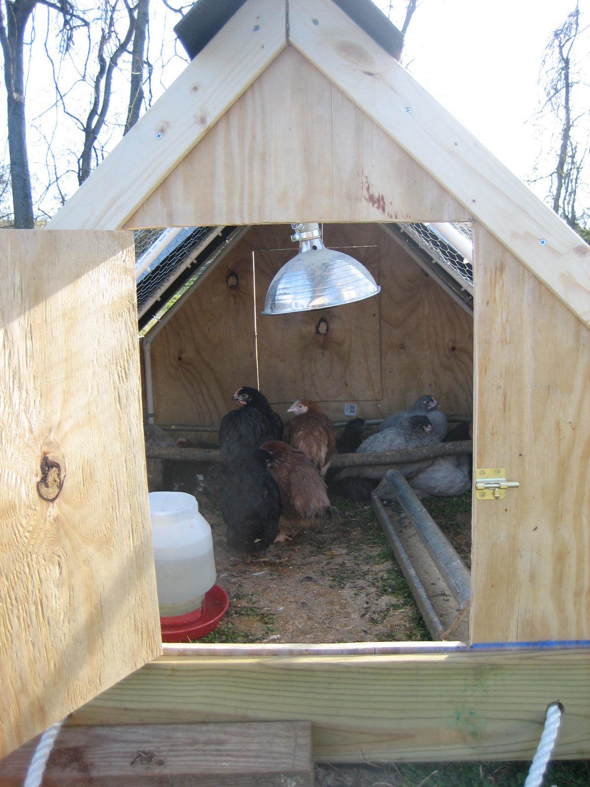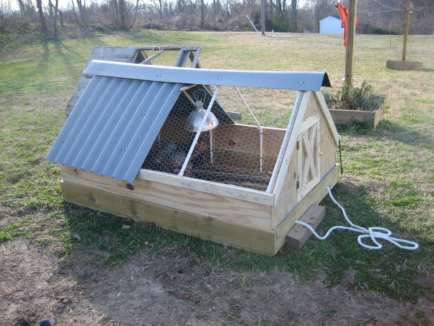The denizens waiting for me to pull it forward for them. The roofing is Ondura and the whole thing is light enough for me to pull myself.