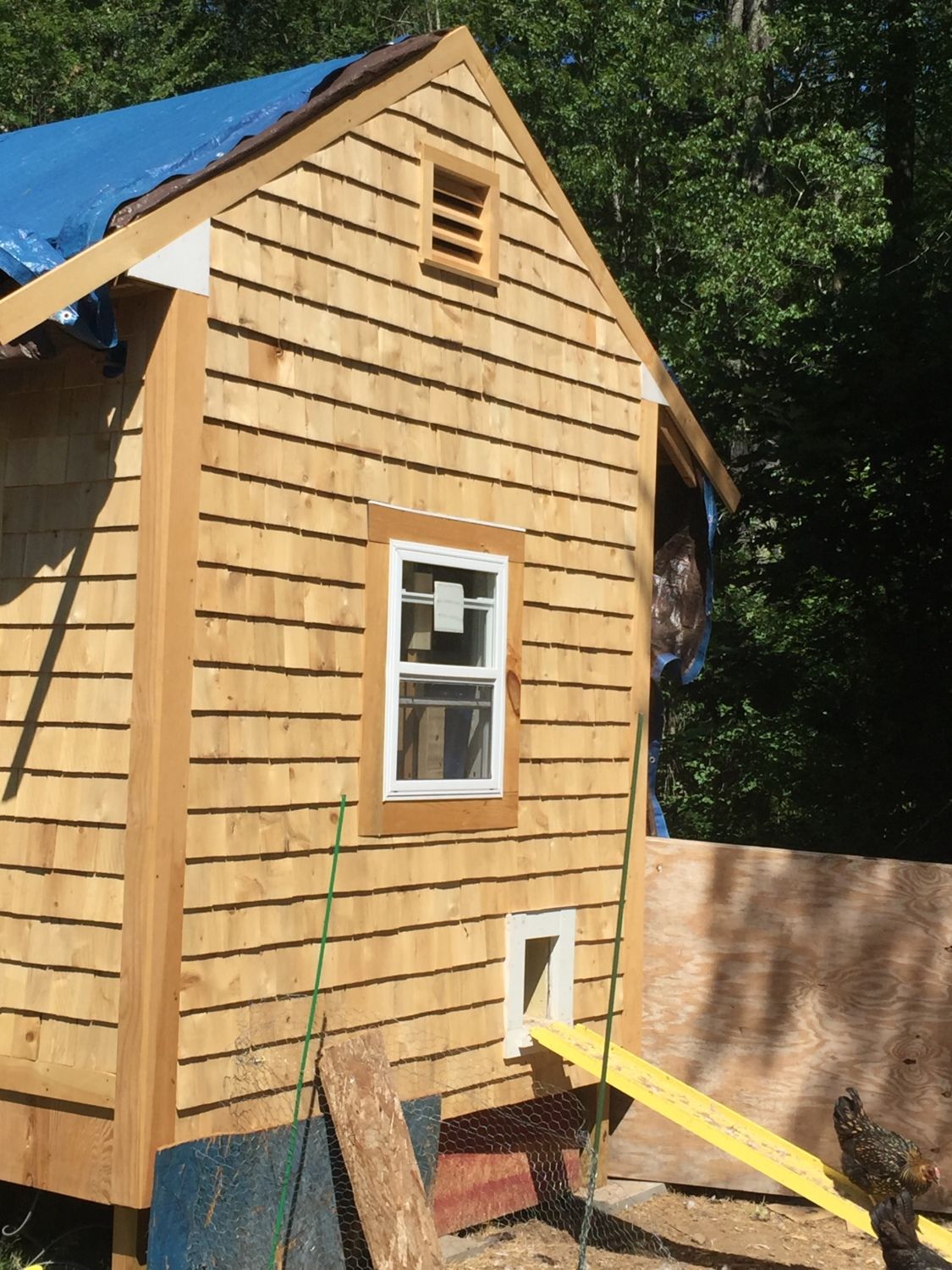 Hi we started this coop back in may when we got the little babies, My dh has done an awsome job so far. its not totally done but the inside is safe for the chicks. its 8x16 we do have a sofett in the front and back for ventilation plus a window on each side except the back and the doors and large window in the front. they all have hardware cloth on them and we are now putting up their run and we will be adding a front porch soon as well. there will be hardware cloth all around the coop and run when we are done. the chickens are only out when we are home and outside. so they are safe. More pics to follow as we go. i was thinking of calling it the FLUFFY BUTT HAVEN. Due to the silkies that i have .