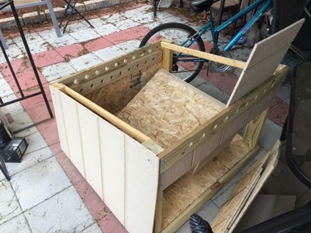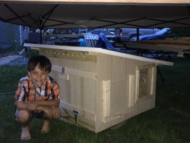 I still need to add eye hooks and a rope for the door (to the right of my son). The large door behind him is for cleaning out the box. (Yes, I realize I put it on upside down. If I had done it right the lines would all match on the siding, but at this point I was like "the heck with it!"