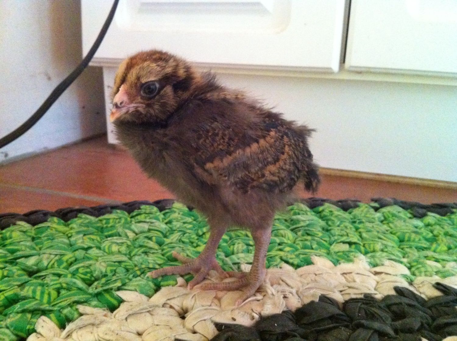 Once today, I ran around the brooder a little and sat on the roost. That made Mum really happy and she made cooing sounds.