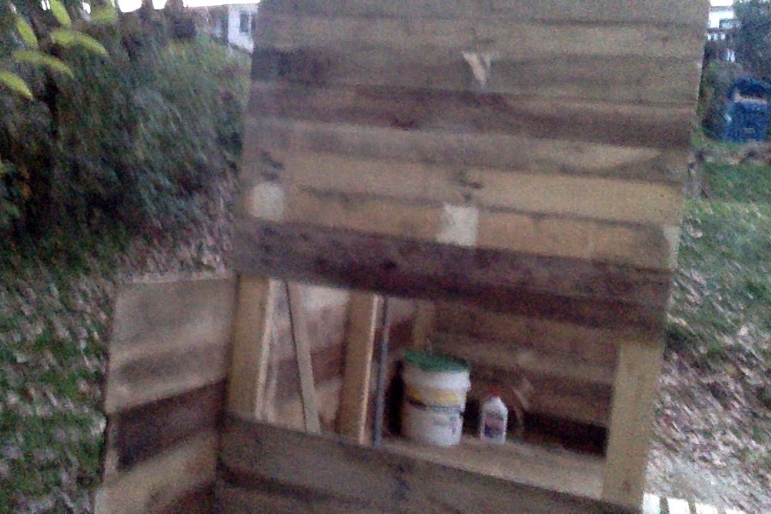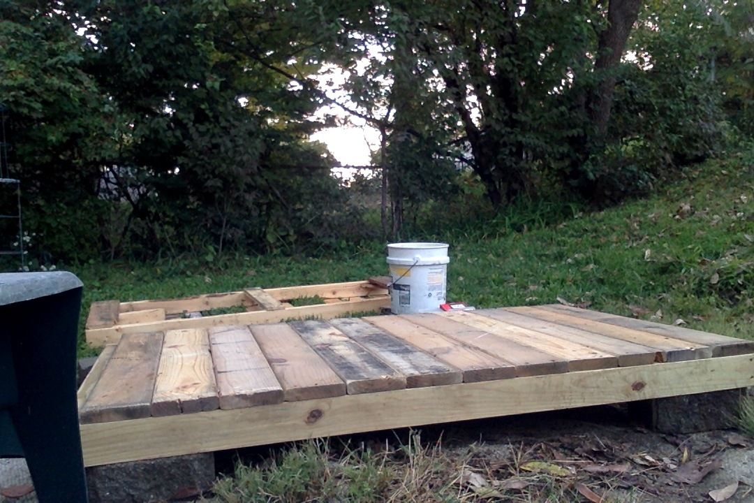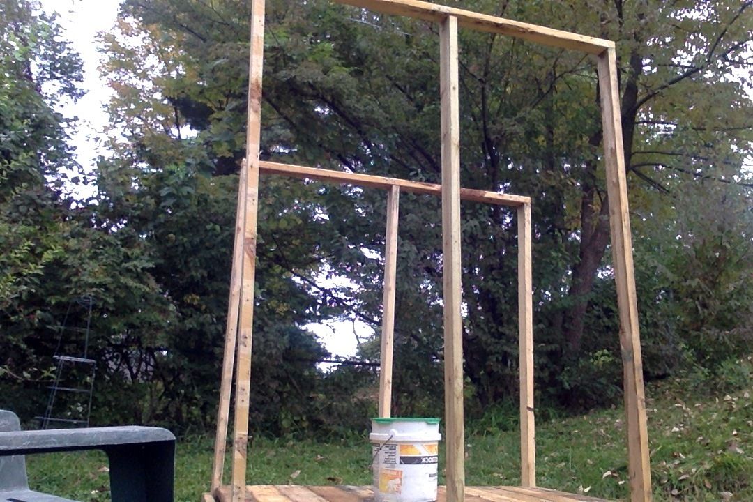 Day 1: On the first day, the hardest part was carrying all the pallets to the work space and taking the ones we needed apart. To do the floor we used 5 old 2' by 4's and cut the length of the front and back side to 5 feet and the sides to 4 feet. After screwing them together we took the wood from a pallet and screwed the planks in as the floor. We set the floor on top of 4 cinder blocks so the wood won't rot.