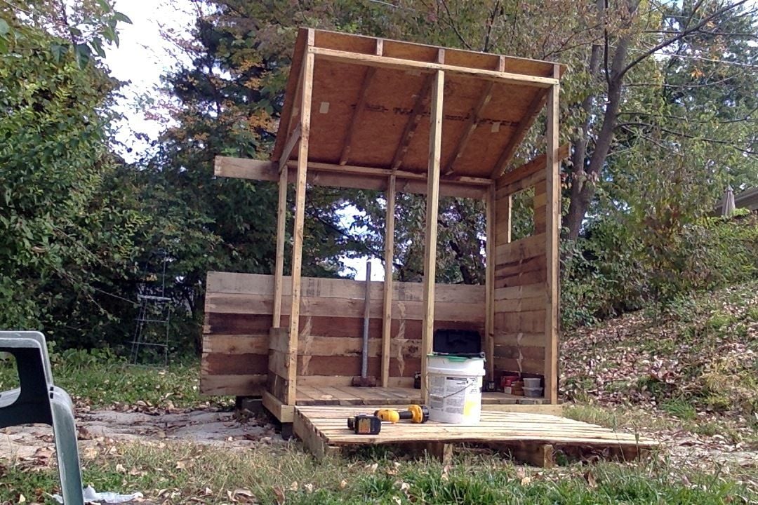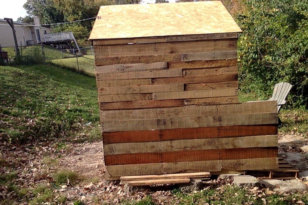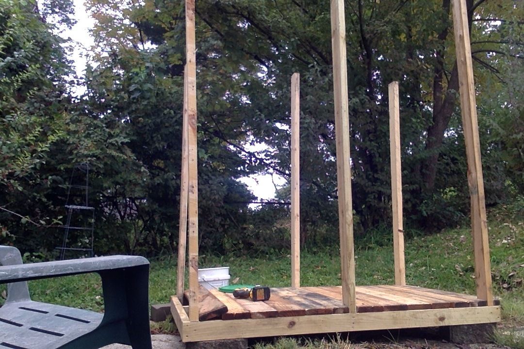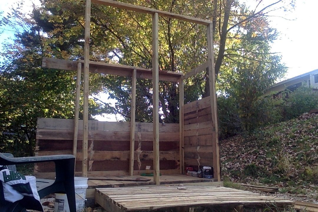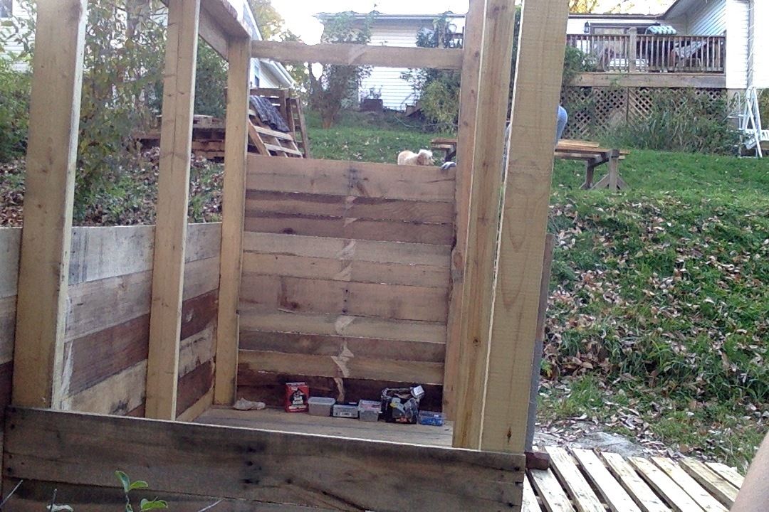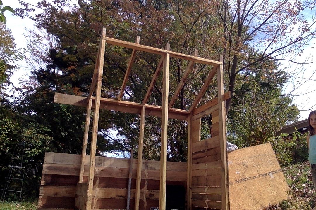 Day 2: On the second day, we had to take apart the pallets with long enough 2' by 4's for the length of the walls. In the back it is about 5 feet and in the front about 7 feet. We also had to cut notches in the bottom to make them fit in the floor (we cut notches in the floor pieces too).