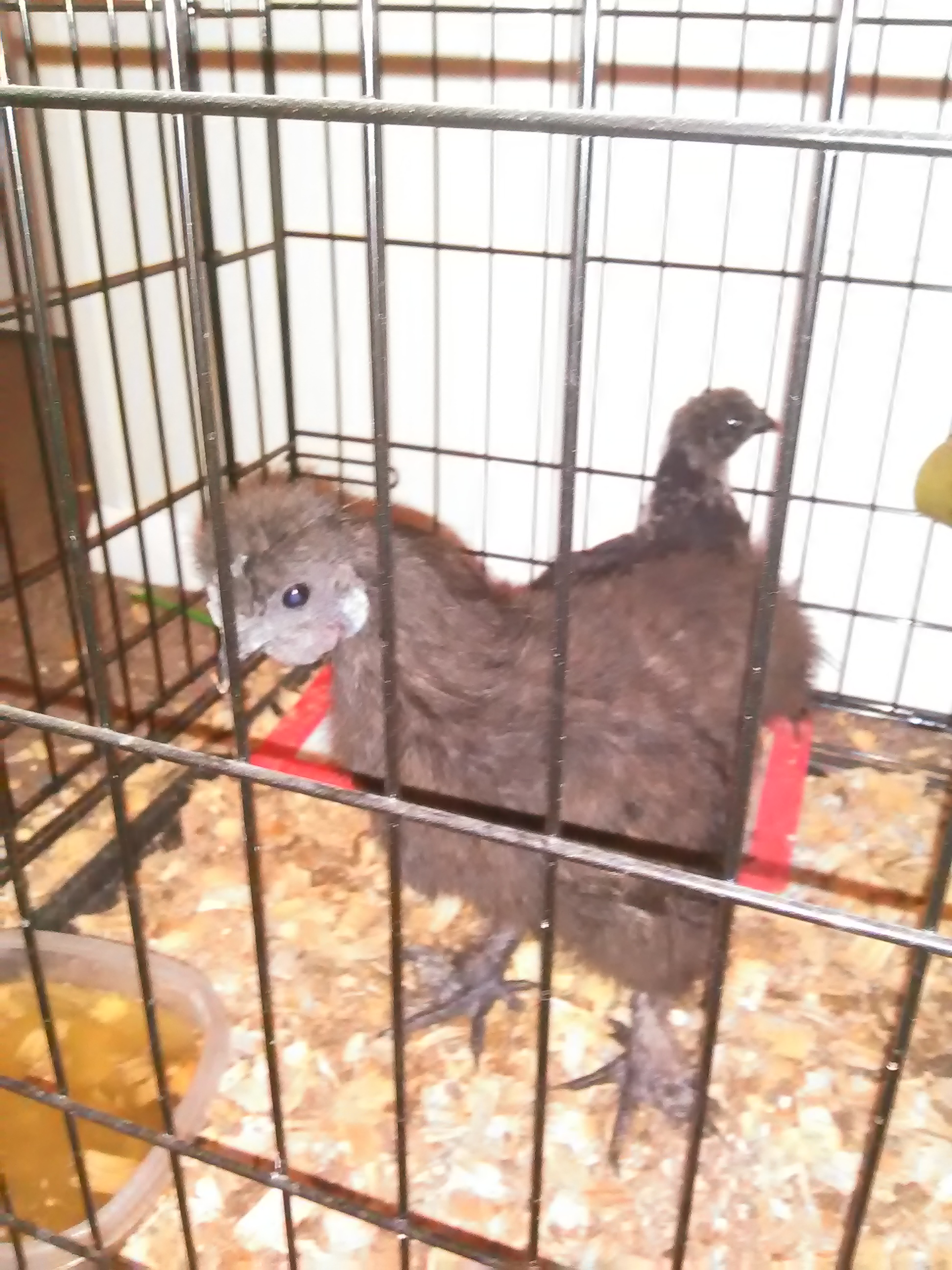 They're all very young (about a week and a half now), spare for one silkie roo (?) and one cemani hen (?), the latter of which is four weeks or so The Cemanis (?) were a steal, and while the paperwork and the parents check out I'm still kind of worried about how they'll turn out. They were trying to clear their stock out though, to make room for the next batch, so we got three for 50$, which... I'm under the impression is really cheap if they're actually Cemanis?