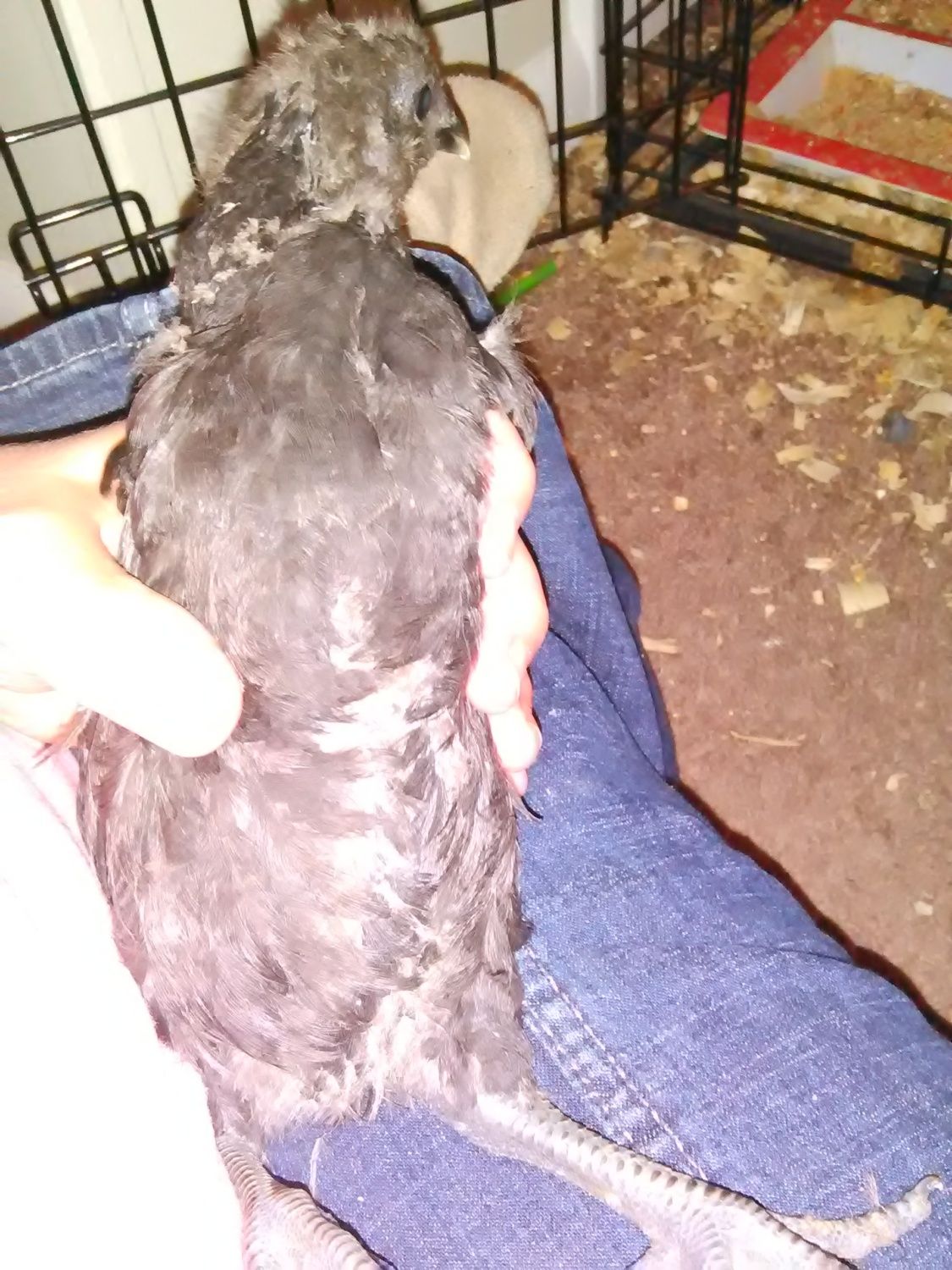 So we got some Ayam Cemani (?) too. They came from a long pedigree with papers, we saw the parents, but I'm a little confused and concerned. First I've read that cemanis are never really phenotypically the same as their parents, so is it possible for a Cemani to have a Kedu as a child, or something similar? I saw the parents, they're black as night, but the chicks have some white floof - or more of a powdering, mostly on the belly; and the older one that's feathering out has a lot of crazy marks on it. Is that normal? How can I tell if they're going to be true ayam cemanis? Is this some "wait and find out" kind of thing? I read something about feathering rate sometimes being an indicator? Can I get some clarification on that?