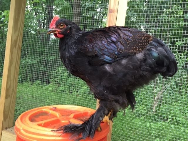 My sweet Hilary is only 11 weeks old and she (he?!) looks distinctively different from my other chickens... I've got six different breeds (all variations on a theme) except for Hilary. Her comb has been pretty red for a while now, but it's her tail feathers that have me really confused-- all my other chickens (brahma, wyandotte, welsummer, buckeye, sultan) look vaguely similar and pointing UP, no one else has these tail feathers that curl down. I'm hoping it's just something different about cochins...?